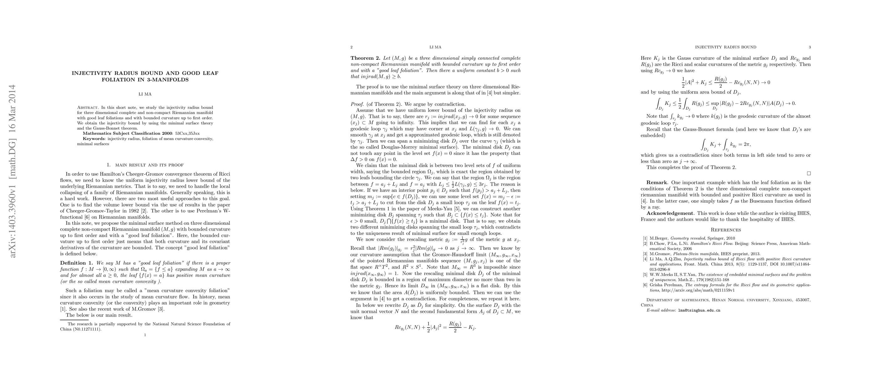 This paper investigates the injectivity radius bound in three-dimensional, complete, and non-compact Riemannian manifolds with good leaf foliations and bounded curvature. The authors derive the injectivity bound using minimal surface theory and the Gauss-Bonnet theorem.