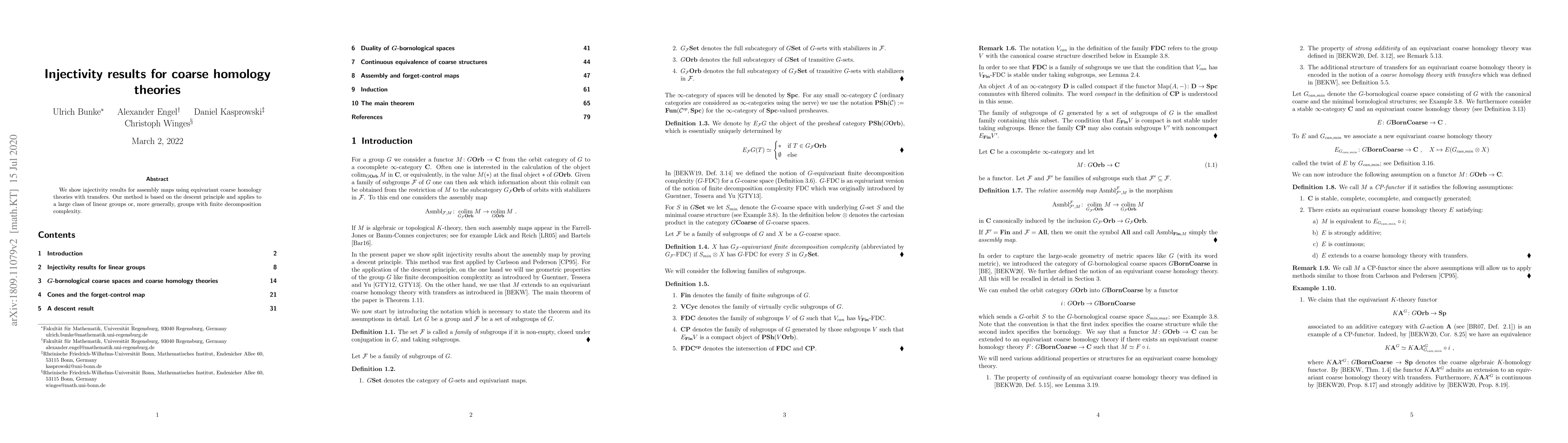This paper establishes injectivity for assembly maps in equivariant coarse homology theories with transfers, utilizing the descent principle, and applies to groups with finite decomposition complexity. The results extend to a broad class of linear groups.
