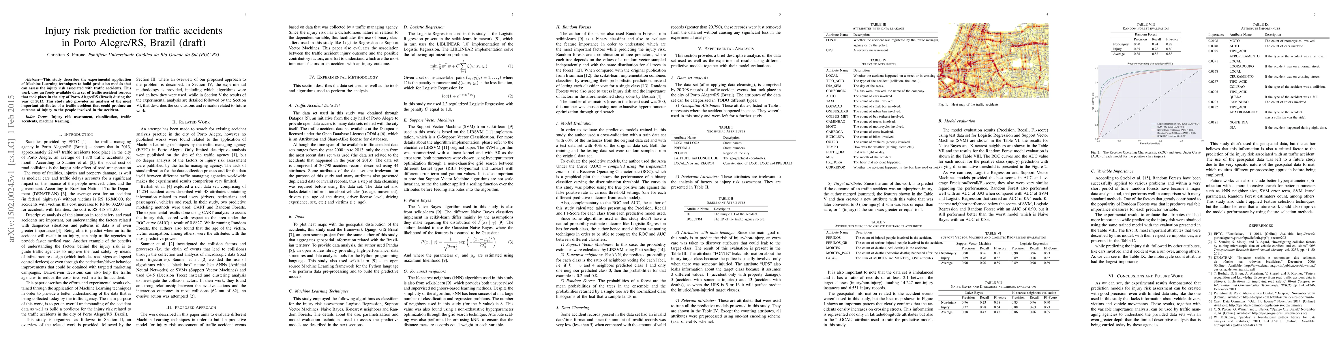 This study applies Machine Learning to predict traffic accident injury risk in Porto Alegre, Brazil using 2013 accident data, identifying key accident attributes contributing to injuries.