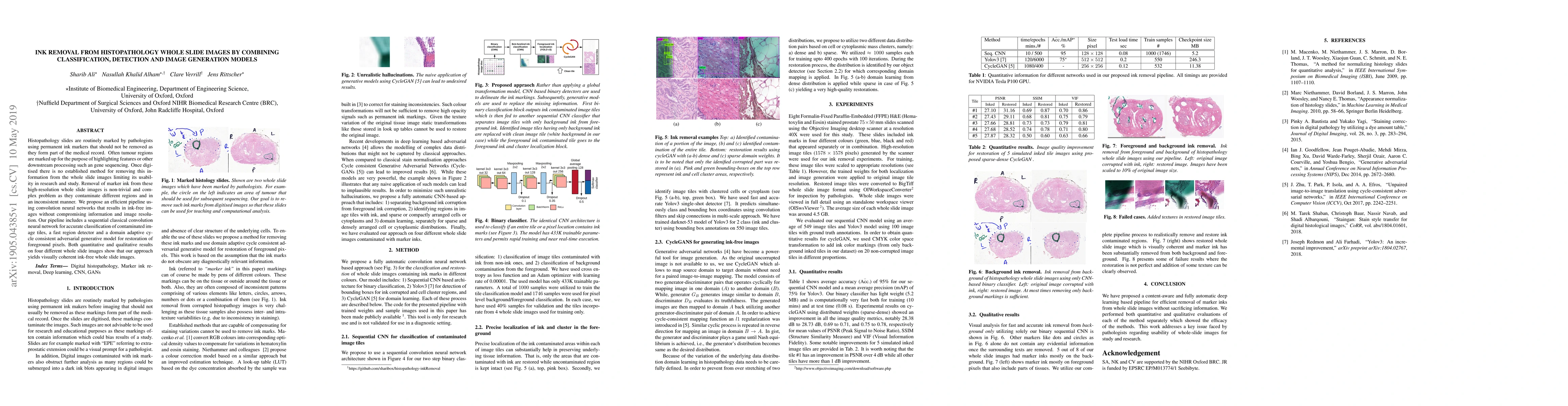 Histopathology slides are routinely marked by pathologists using permanent ink markers that should not be removed as they form part of the medical record. Often tumour regions are marked up for the purpose of highlighting features or other downstream processing such an gene sequencing. Once digitised there is no established method for removing this information from the whole slide images limiting its usability in research and study. Removal of marker ink from these high-resolution whole slide images is non-trivial and complex problem as they contaminate different regions and in an inconsistent manner. We propose an efficient pipeline using convolution neural networks that results in ink-free images without compromising information and image resolution. Our pipeline includes a sequential classical convolution neural network for accurate classification of contaminated image tiles, a fast region detector and a domain adaptive cycle consistent adversarial generative model for restoration of foreground pixels. Both quantitative and qualitative results on four different whole slide images show that our approach yields visually coherent ink-free whole slide images.