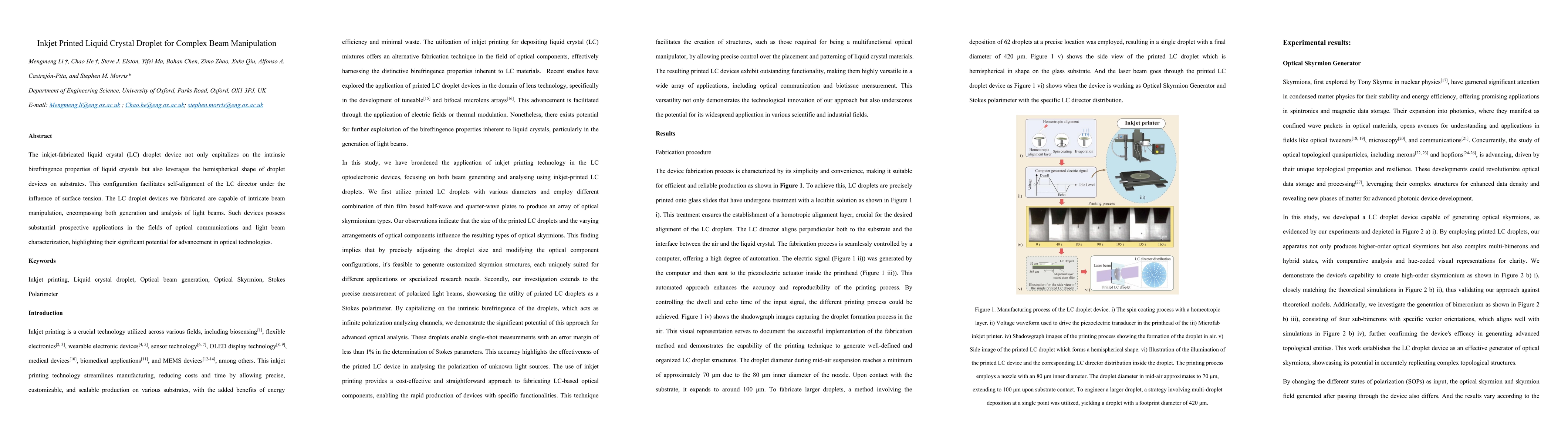 The inkjet-fabricated liquid crystal (LC) droplet device not only capitalizes on the intrinsic birefringence properties of liquid crystals but also leverages the hemispherical shape of droplet devices on substrates. This configuration facilitates self-alignment of the LC director under the influence of surface tension. The LC droplet devices we fabricated are capable of intricate beam manipulation, encompassing both generation and analysis of light beams. Such devices possess substantial prospective applications in the fields of optical communications and light beam characterization, highlighting their significant potential for advancement in optical technologies.