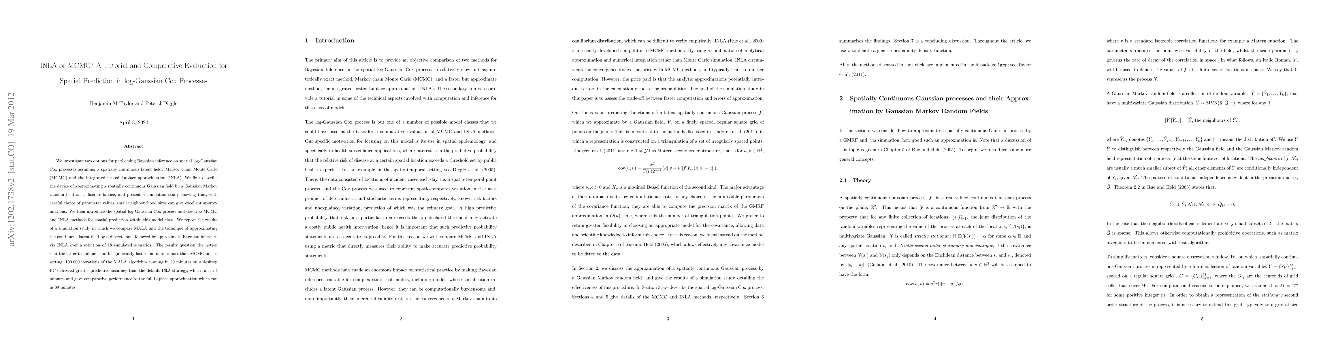 This paper compares Markov chain Monte Carlo (MCMC) and integrated nested Laplace approximation (INLA) for spatial prediction in log-Gaussian Cox processes. The study found that while INLA is faster, MCMC with 100,000 iterations delivered greater predictive accuracy than INLA, challenging the notion that INLA is superior in both speed and robustness.