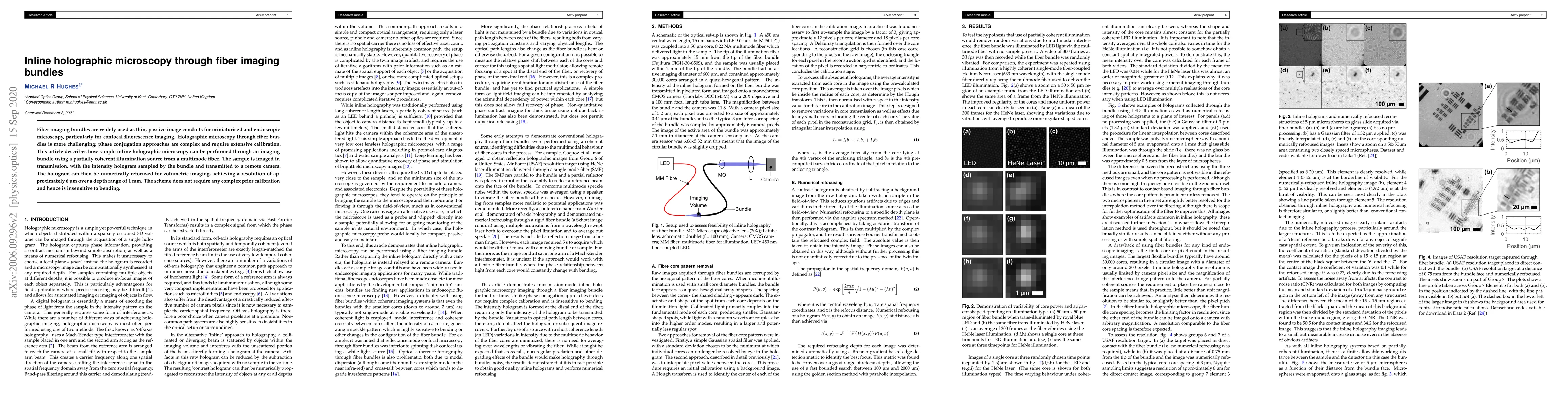This paper presents an inline holographic microscopy technique using fiber imaging bundles and a multimode fiber for partially coherent illumination, enabling volumetric imaging without complex calibration, achieving a resolution of 6 µm over 1 mm depth. The method is robust to bending due to its simple setup.
