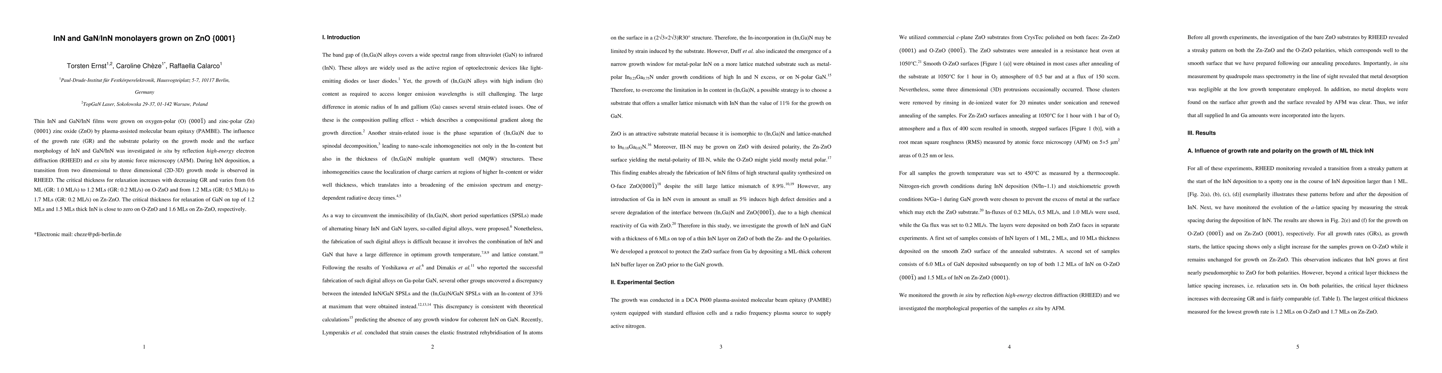Thin InN and GaN/InN films were grown on oxygen-polar (O) (000-1) and zinc-polar (Zn) (0001) zinc oxide (ZnO) by plasma-assisted molecular beam epitaxy (PAMBE). The influence of the growth rate (GR) and the substrate polarity on the growth mode and the surface morphology of InN and GaN/InN was investigated in situ by reflection high-energy electron diffraction (RHEED) and ex situ by atomic force microscopy (AFM). During InN deposition, a transition from two dimensional to three dimensional (2D-3D) growth mode is observed in RHEED. The critical thickness for relaxation increases with decreasing GR and varies from 0.6 ML (GR: 1.0 ML/s) to 1.2 MLs (GR: 0.2 ML/s) on O-ZnO and from 1.2 MLs (GR: 0.5 ML/s) to 1.7 MLs (GR: 0.2 ML/s) on Zn-ZnO. The critical thickness for relaxation of GaN on top of 1.2 MLs and 1.5 MLs thick InN is close to zero on O-ZnO and 1.6 MLs on Zn-ZnO, respectively.