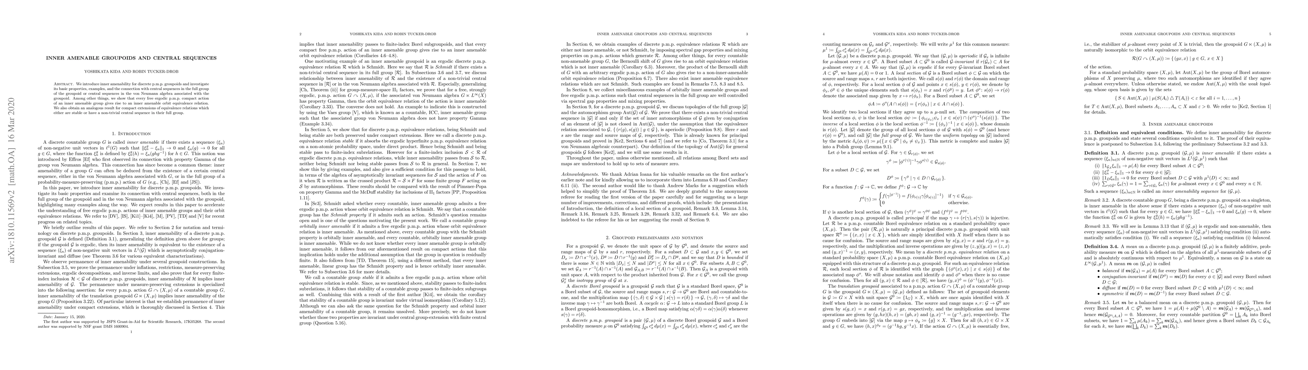 We introduce inner amenability for discrete p.m.p. groupoids and investigate its basic properties, examples, and the connection with central sequences in the full group of the groupoid or central sequences in the von Neumann algebra associated with the groupoid. Among other things, we show that every free ergodic p.m.p. compact action of an inner amenable group gives rise to an inner amenable orbit equivalence relation. We also obtain an analogous result for compact extensions of equivalence relations which either are stable or have a non-trivial central sequence in their full group.