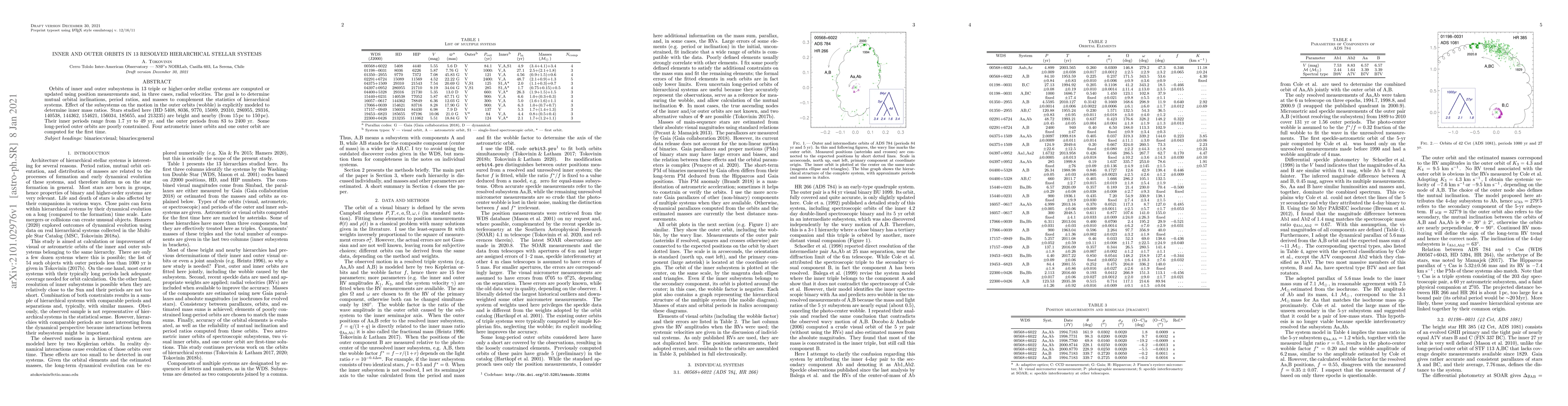 This paper computes or updates the orbits of inner and outer subsystems in 13 resolved hierarchical stellar systems, aiming to determine mutual orbital inclinations, period ratios, and masses, and models the effect of inner subsystems on outer orbits to derive inner mass ratios. The study focuses on bright, nearby stars with inner periods ranging from 1.7 to 49 years and outer periods from 83 to 2400 years.