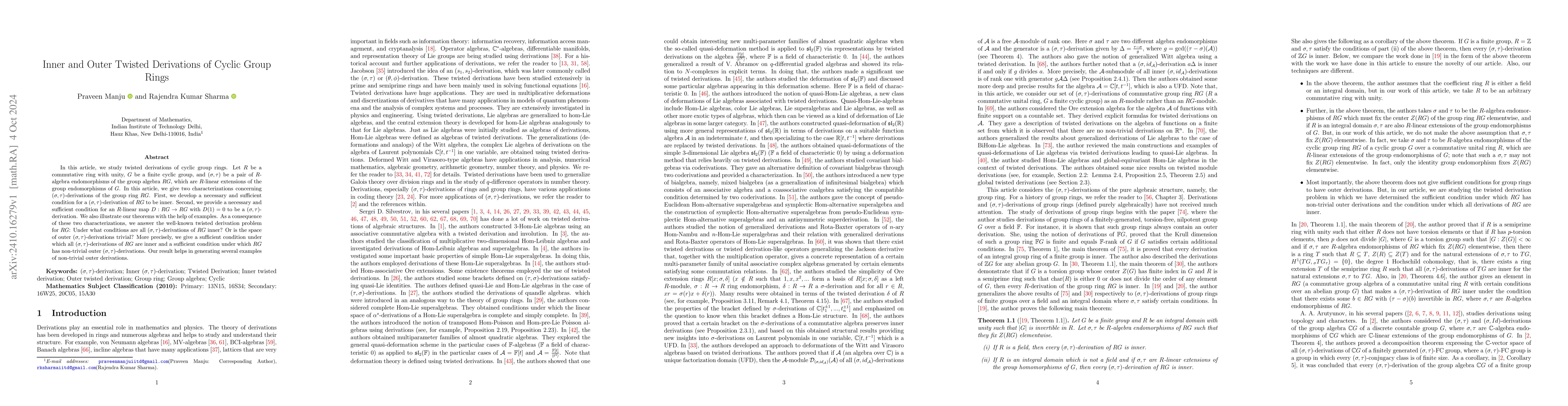 This paper studies twisted derivations of cyclic group rings, providing characterizations for $(\sigma, \tau)$-derivations. It establishes conditions for these derivations to be inner or outer, resolving the twisted derivation problem for such rings and illustrating results with examples.