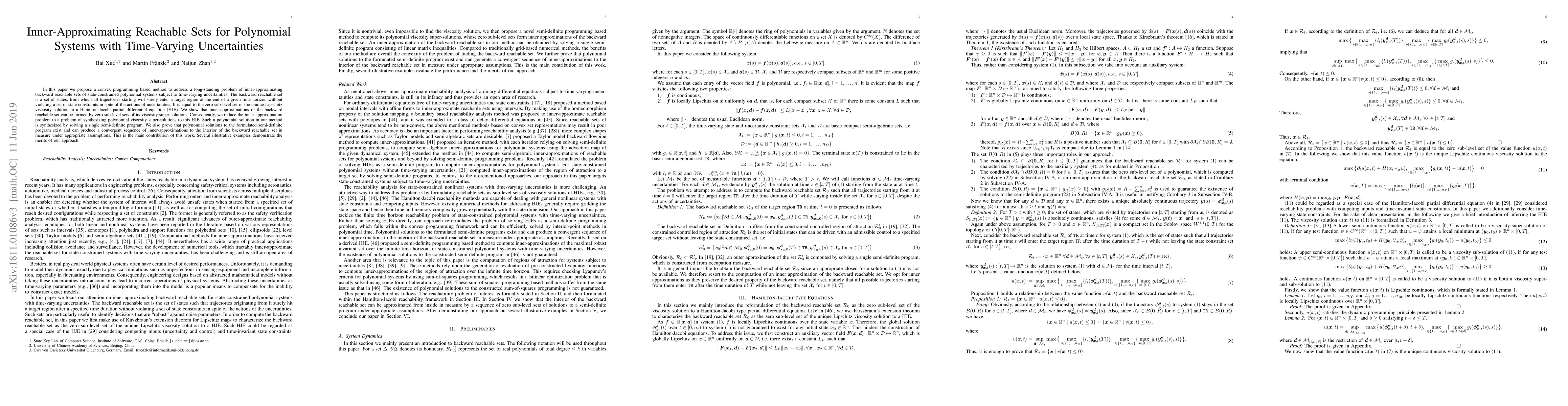 In this paper we propose a convex programming based method to address a long-standing problem of inner-approximating backward reachable sets of state-constrained polynomial systems subject to time-varying uncertainties. The backward reachable set is a set of states, from which all trajectories starting will surely enter a target region at the end of a given time horizon without violating a set of state constraints in spite of the actions of uncertainties. It is equal to the zero sub-level set of the unique Lipschitz viscosity solution to a Hamilton-Jacobi partial differential equation (HJE). We show that inner-approximations of the backward reachable set can be formed by zero sub-level sets of its viscosity super-solutions. Consequently, we reduce the inner-approximation problem to a problem of synthesizing polynomial viscosity super-solutions to this HJE. Such a polynomial solution in our method is synthesized by solving a single semi-definite program. We also prove that polynomial solutions to the formulated semi-definite program exist and can produce a convergent sequence of inner-approximations to the interior of the backward reachable set in measure under appropriate assumptions. This is the main contribution of this work. Several illustrative examples demonstrate the merits of our approach.