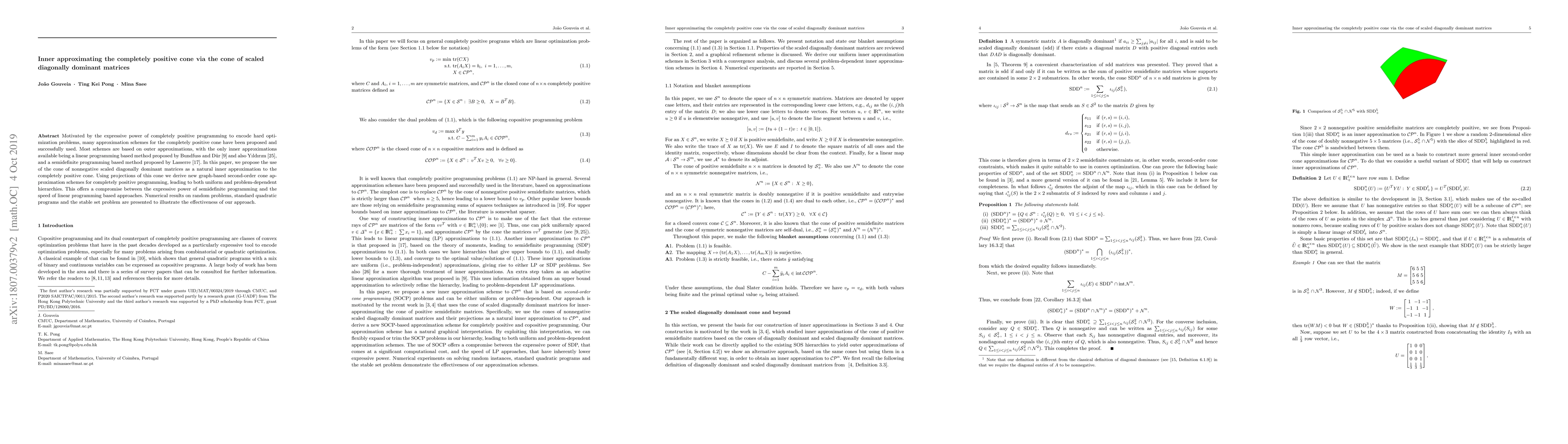 This paper proposes using the cone of nonnegative scaled diagonally dominant matrices as an inner approximation to the completely positive cone, developing new second-order cone approximation schemes. These schemes offer a balance between the expressive power of semidefinite programming and the speed of linear programming, as demonstrated by numerical results on various optimization problems.