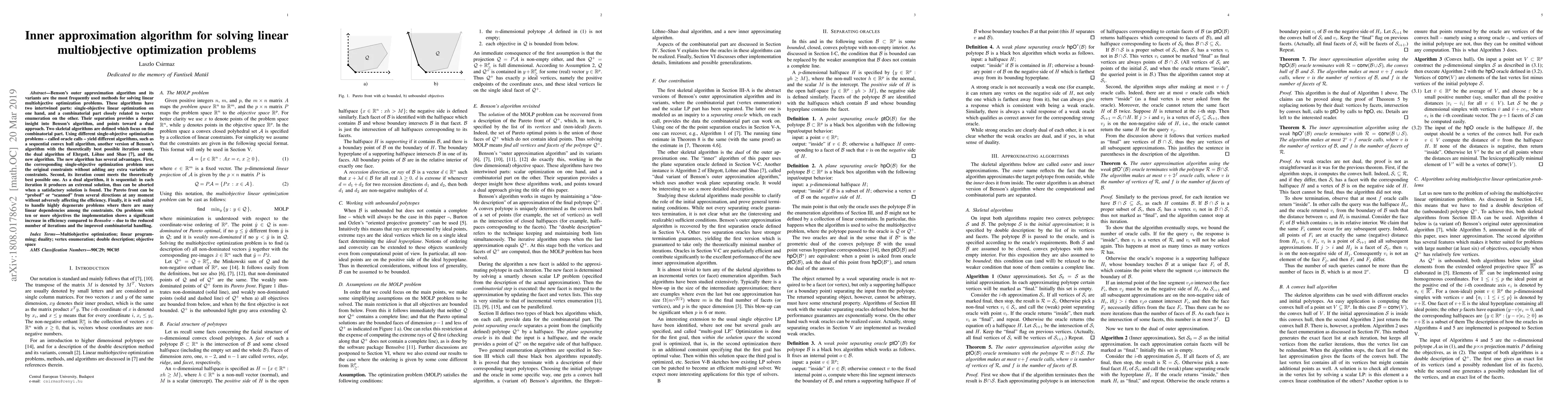 This paper proposes an inner approximation algorithm for linear multiobjective optimization, contrasting with Benson's outer approximation method. The new algorithm efficiently handles combinatorial components, reduces iteration counts, and improves performance on problems with many objectives by leveraging original constraints without extra variables or constraints.