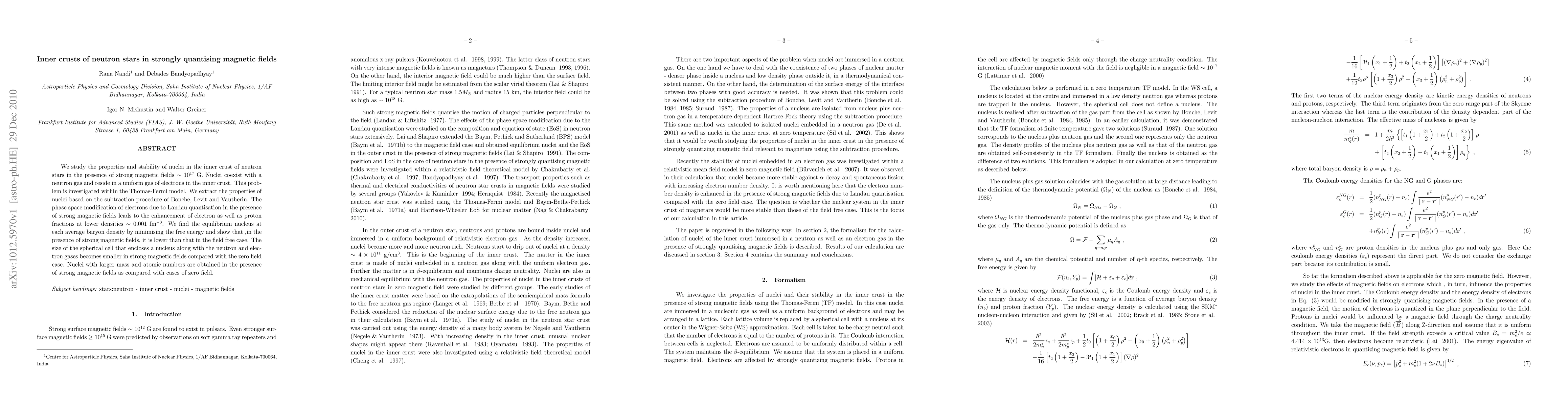 We study the properties and stability of nuclei in the inner crust of neutron stars in the presence of strong magnetic fields $\sim 10^{17}$ G. Nuclei coexist with a neutron gas and reside in a uniform gas of electrons in the inner crust. This problem is investigated within the Thomas-Fermi model. We extract the properties of nuclei based on the subtraction procedure of Bonche, Levit and Vautherin. The phase space modification of electrons due to Landau quantisation in the presence of strong magnetic fields leads to the enhancement of electron as well as proton fractions at lower densities $\sim 0.001$ fm$^{-3}$. We find the equilibrium nucleus at each average baryon density by minimising the free energy and show that, in the presence of strong magnetic fields, it is lower than that in the field free case. The size of the spherical cell that encloses a nucleus along with the neutron and electron gases becomes smaller in strong magnetic fields compared with the zero field case. Nuclei with larger mass and atomic numbers are obtained in the presence of strong magnetic fields as compared with cases of zero field.