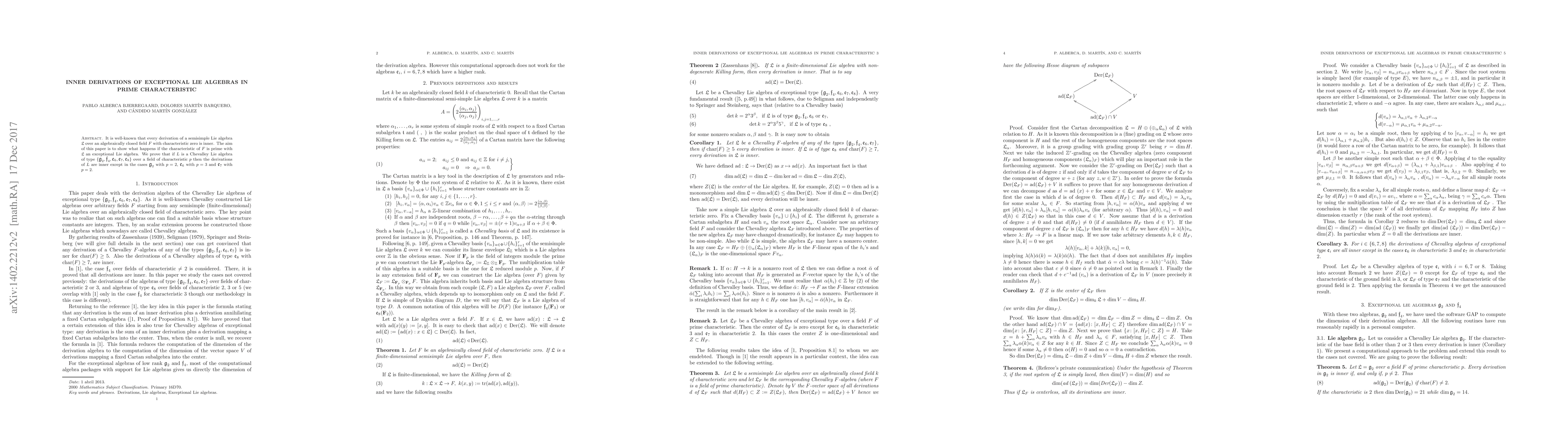 This paper investigates derivations of exceptional Lie algebras in fields of prime characteristic, finding that derivations of exceptional Lie algebras (except for specific cases) remain inner, contrasting with the characteristic zero scenario. Exceptions occur for $G_2$ with $p=2$, $E_6$ with $p=3$, and $E_7$ with $p=2$.