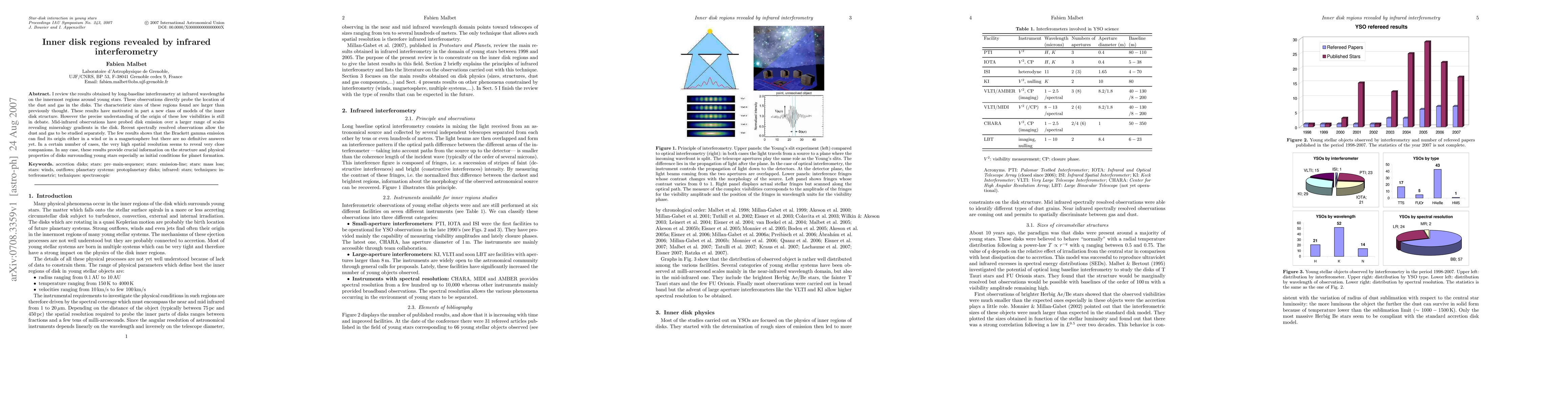 I review the results obtained by long-baseline interferometry at infrared wavelengths on the innermost regions around young stars. These observations directly probe the location of the dust and gas in the disks. The characteristic sizes of these regions found are larger than previously thought. These results have motivated in part a new class of models of the inner disk structure. However the precise understanding of the origin of these low visibilities is still in debate. Mid-infrared observations have probed disk emission over a larger range of scales revealing mineralogy gradients in the disk. Recent spectrally resolved observations allow the dust and gas to be studied separately. The few results shows that the Brackett gamma emission can find its origin either in a wind or in a magnetosphere but there are no definitive answers yet. In a certain number of cases, the very high spatial resolution seems to reveal very close companions. In any case, these results provide crucial information on the structure and physical properties of disks surrounding young stars especially as initial conditions for planet formation.