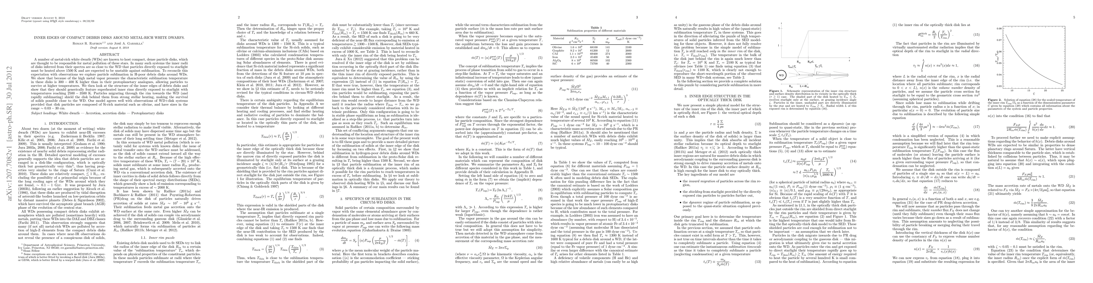 This paper investigates the inner edges of compact debris disks around metal-rich white dwarfs, finding that high metal vapor pressure raises sublimation temperatures by 300-400 K, allowing particles to survive closer to the WD. It concludes that these inner rims can reach temperatures of 2500-3500 K, with particles migrating inward shielding the disk from stellar heating.