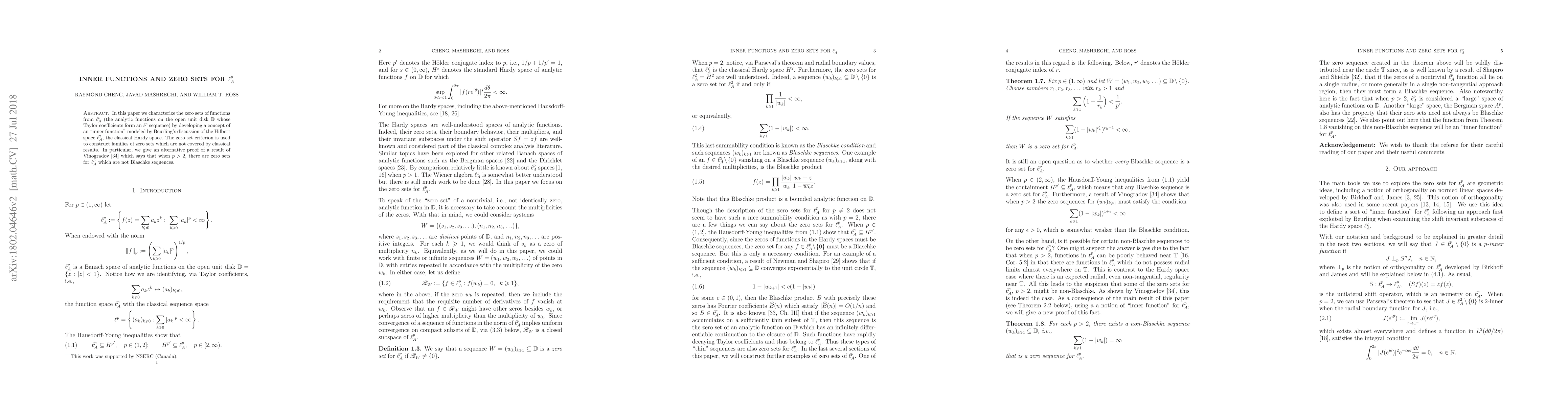 In this paper we characterize the zero sets of functions from $\ell^{p}_{A}$ (the analytic functions on the open unit disk $D$ whose Taylor coefficients form an $\ell^p$ sequence) by developing a concept of an "inner function" modeled by Beurling's discussion of the Hilbert space $\ell^{2}_{A}$ (the classical Hardy space). The zero set criterion is used to construct families of zero sets which are not covered by classical results. In particular, it is proved that when $p > 2$, there are zero sets for $\ell^{p}_{A}$ which are not Blaschke sequences.