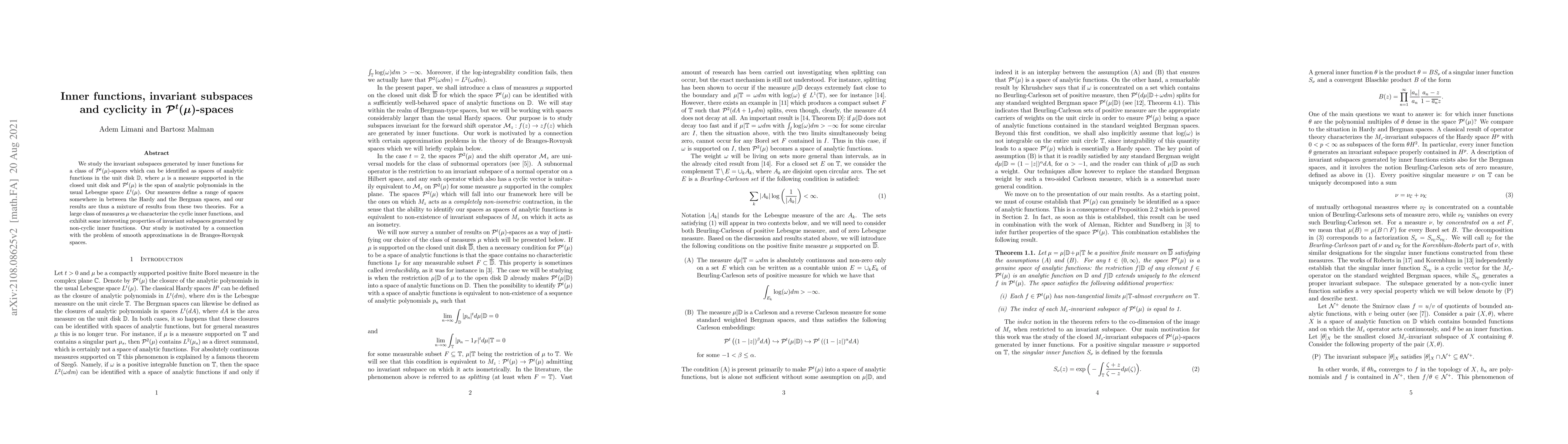 We study the invariant subspaces generated by inner functions for a class of $\mathcal{P}^t(\mu)$-spaces which can be identified as spaces of analytic functions in the unit disk $\mathbb{D}$, where $\mu$ is a measure supported in the closed unit disk and $\mathcal{P}^t(\mu)$ is the span of analytic polynomials in the usual Lebesgue space $L^t(\mu)$. Our measures define a range of spaces somewhere in between the Hardy and the Bergman spaces, and our results are thus a mixture of results from these two theories. For a large class of measures $\mu$ we characterize the cyclic inner functions, and exhibit some interesting properties of invariant subspaces generated by non-cyclic inner functions. Our study is motivated by a connection with the problem of smooth approximations in de Branges-Rovnyak spaces.