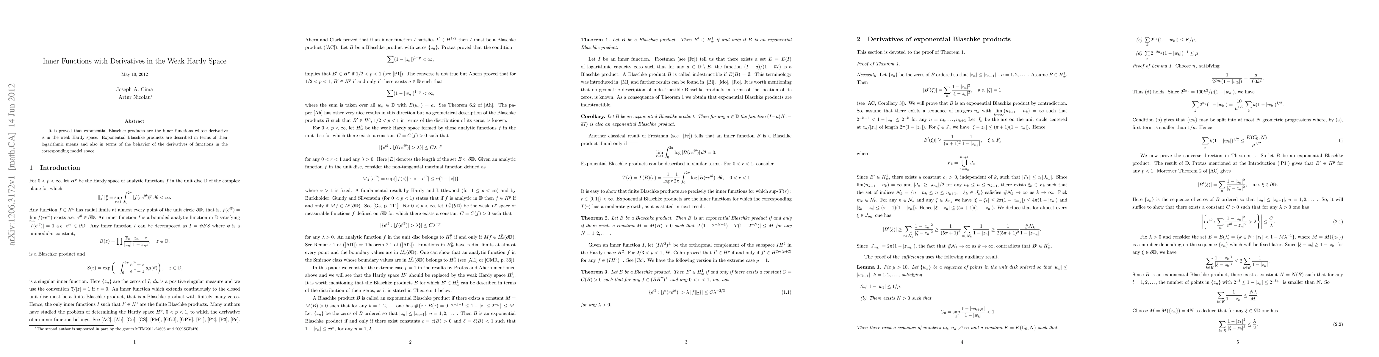 The research establishes that exponential Blaschke products are the inner functions with derivatives in the weak Hardy space, characterizing them via logarithmic means and derivative behavior in related model spaces.