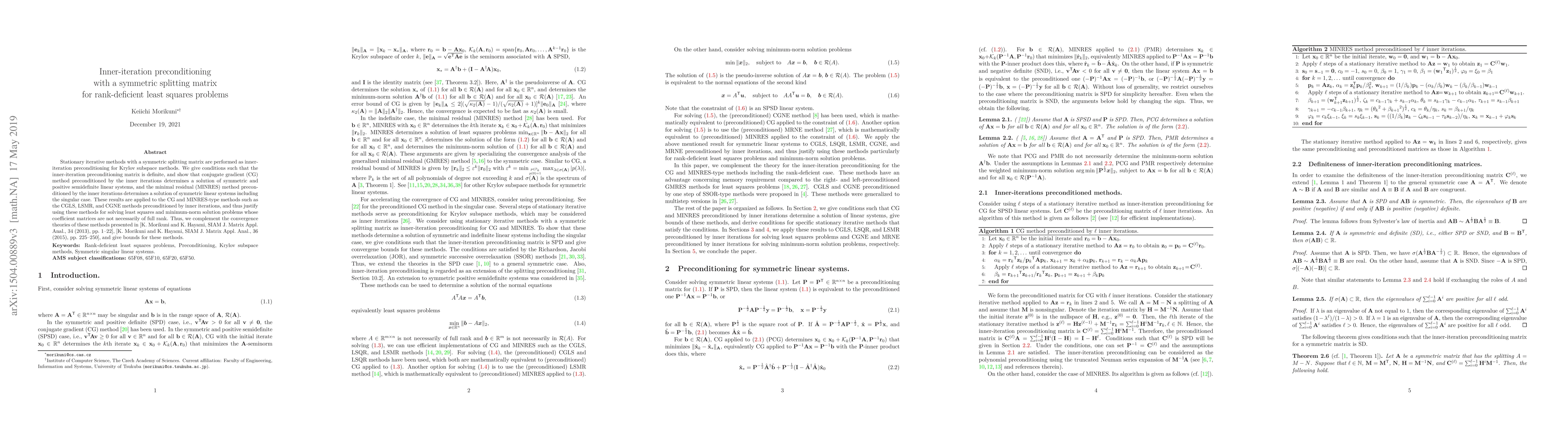 This paper explores the use of inner-iteration preconditioning with a symmetric splitting matrix for solving rank-deficient least squares problems. It establishes conditions for the preconditioning matrix's definiteness and demonstrates the effectiveness of preconditioned conjugate gradient and minimal residual methods for symmetric linear systems, including singular cases.