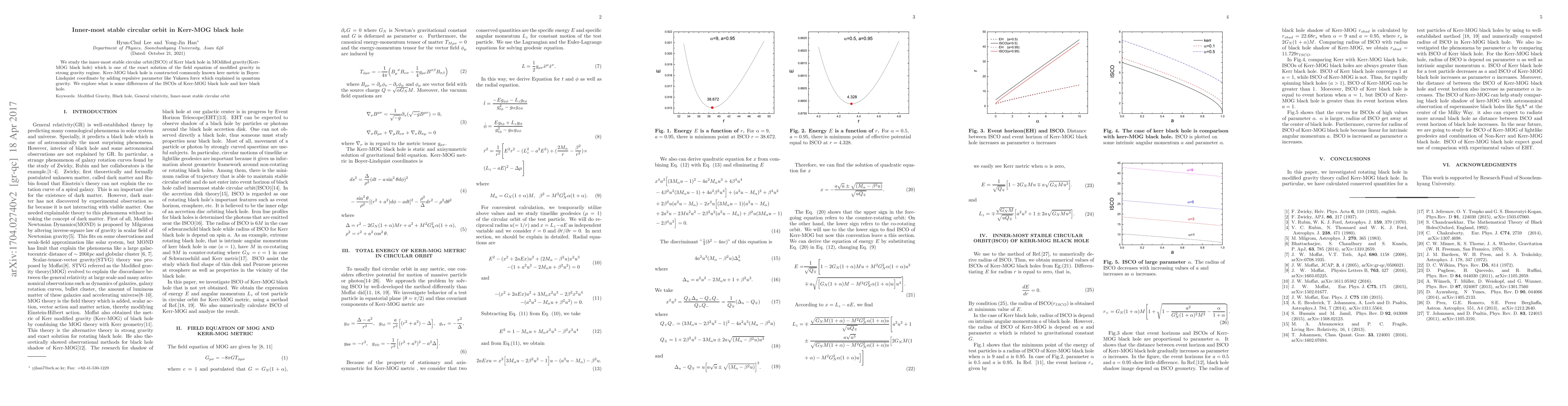 We study the inner-most stable circular orbit(ISCO) of Kerr black hole in MOdified gravity(Kerr-MOG black hole) which is one of the exact solution of the field equation of modified gravity in strong gravity regime. Kerr-MOG black hole is constructed commonly known kerr metric in Boyer-Lindquist coordinate by adding repulsive parameter like Yukawa force which explained in quantum gravity. We explore what is some differences of the ISCOs of Kerr-MOG black hole and kerr black hole.