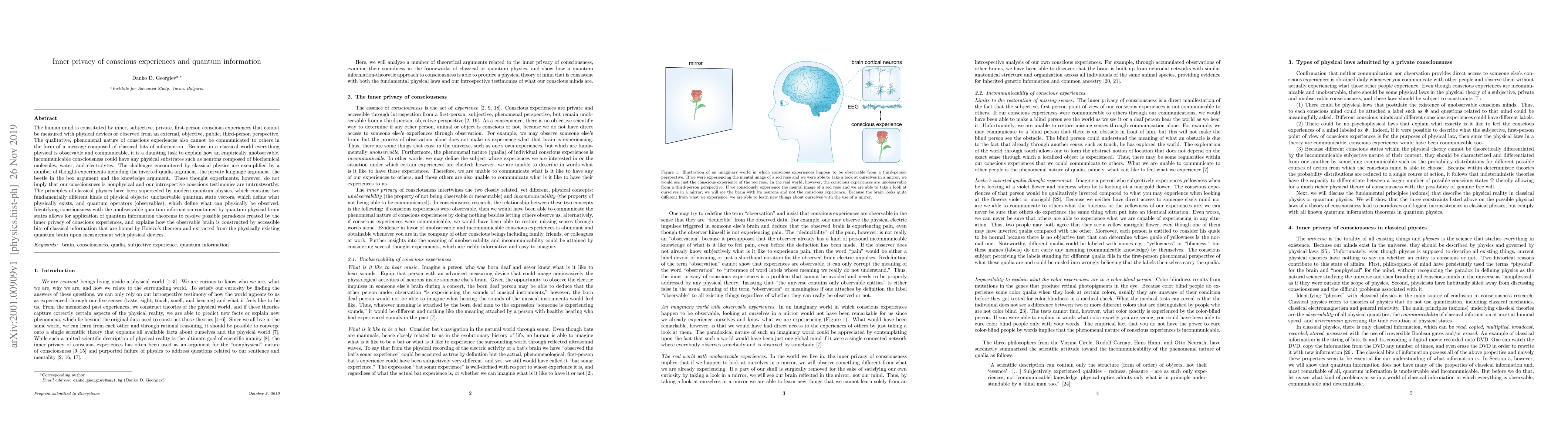 The human mind is constituted by inner, subjective, private, first-person conscious experiences that cannot be measured with physical devices or observed from an external, objective, public, third-person perspective. The qualitative, phenomenal nature of conscious experiences also cannot be communicated to others in the form of a message composed of classical bits of information. Because in a classical world everything physical is observable and communicable, it is a daunting task to explain how an empirically unobservable, incommunicable consciousness could have any physical substrates such as neurons composed of biochemical molecules, water, and electrolytes. The challenges encountered by classical physics are exemplified by a number of thought experiments including the inverted qualia argument, the private language argument, the beetle in the box argument and the knowledge argument. These thought experiments, however, do not imply that our consciousness is nonphysical and our introspective conscious testimonies are untrustworthy. The principles of classical physics have been superseded by modern quantum physics, which contains two fundamentally different kinds of physical objects: unobservable quantum state vectors, which define what physically exists, and quantum operators (observables), which define what can physically be observed. Identifying consciousness with the unobservable quantum information contained by quantum physical brain states allows for application of quantum information theorems to resolve possible paradoxes created by the inner privacy of conscious experiences, and explains how the observable brain is constructed by accessible bits of classical information that are bound by Holevo's theorem and extracted from the physically existing quantum brain upon measurement with physical devices.