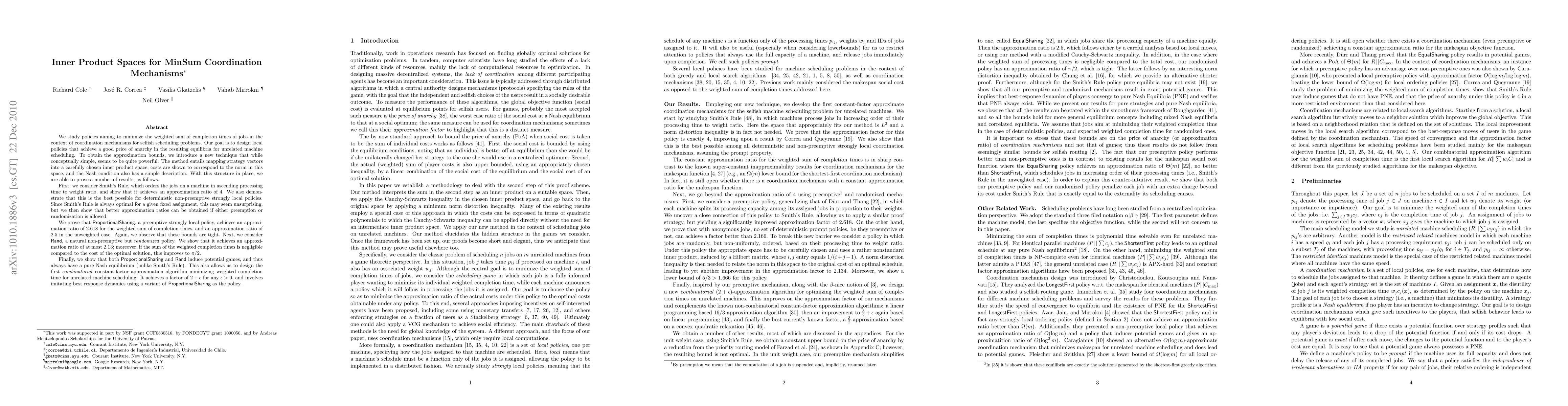 We study policies aiming to minimize the weighted sum of completion times of jobs in the context of coordination mechanisms for selfish scheduling problems. Our goal is to design local policies that achieve a good price of anarchy in the resulting equilibria for unrelated machine scheduling. To obtain the approximation bounds, we introduce a new technique that while conceptually simple, seems to be quite powerful. With this method we are able to prove the following results. First, we consider Smith's Rule, which orders the jobs on a machine in ascending processing time to weight ratio, and show that it achieves an approximation ratio of 4. We also demonstrate that this is the best possible for deterministic non-preemptive strongly local policies. Since Smith's Rule is always optimal for a given assignment, this may seem unsurprising, but we then show that better approximation ratios can be obtained if either preemption or randomization is allowed. We prove that ProportionalSharing, a preemptive strongly local policy, achieves an approximation ratio of 2.618 for the weighted sum of completion times, and an approximation ratio of 2.5 in the unweighted case. Again, we observe that these bounds are tight. Next, we consider Rand, a natural non-preemptive but randomized policy. We show that it achieves an approximation ratio of at most 2.13; moreover, if the sum of the weighted completion times is negligible compared to the cost of the optimal solution, this improves to \pi /2. Finally, we show that both ProportionalSharing and Rand induce potential games, and thus always have a pure Nash equilibrium (unlike Smith's Rule). This also allows us to design the first \emph{combinatorial} constant-factor approximation algorithm minimizing weighted completion time for unrelated machine scheduling that achieves a factor of 2+ \epsilon for any \epsilon > 0.
