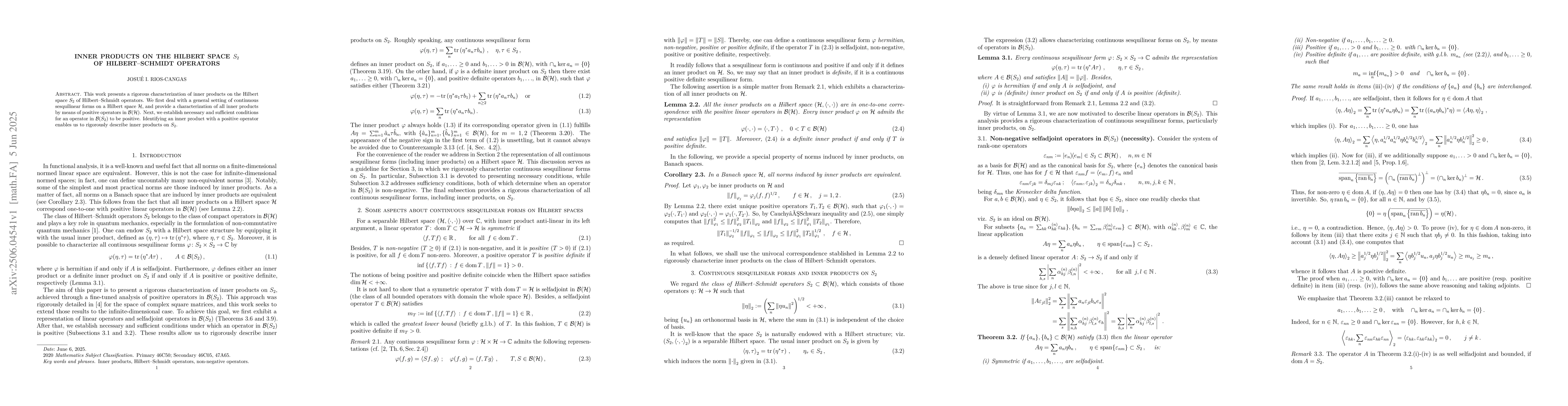 The paper provides a rigorous characterization of inner products on the Hilbert space $S_2$ of Hilbert--Schmidt operators, starting from a general setting of continuous sesquilinear forms on a Hilbert space $\mathcal H$ and using positive operators in $\mathcal {B(H)}$ for characterization.