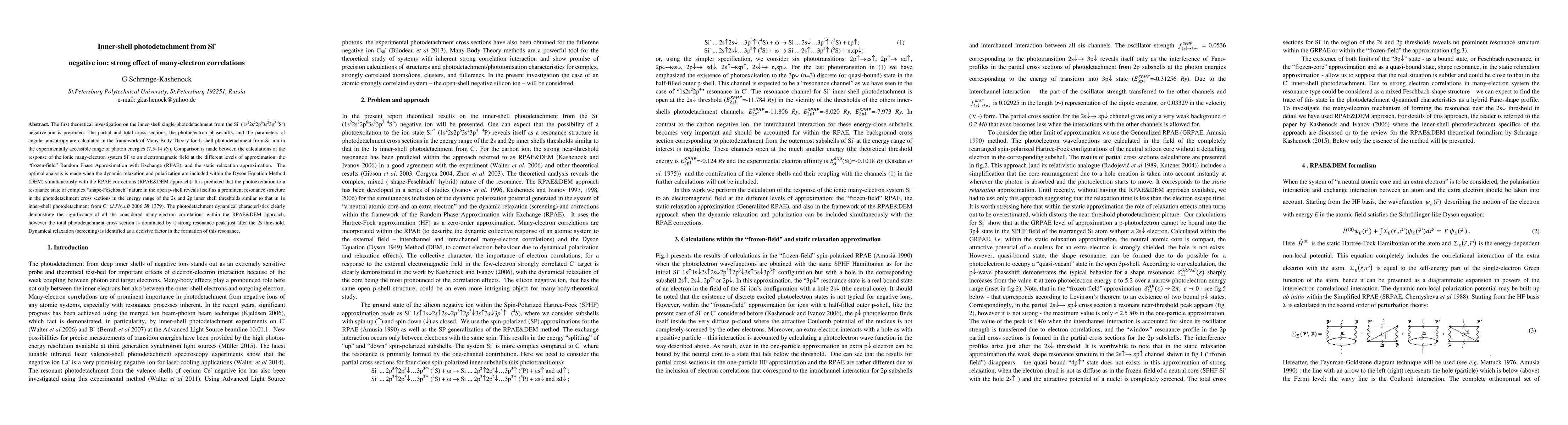 This paper presents a theoretical study on inner-shell photodetachment from Si- ions, revealing the importance of many-electron correlations. The RPAE&DEM approach shows that dynamic relaxation significantly influences the resonance peak near the 2s threshold, highlighting the necessity of considering all many-electron effects for accurate predictions.