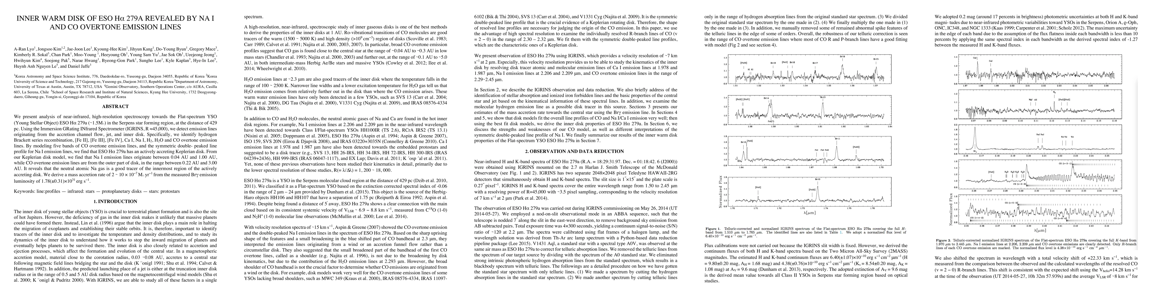 This study uses high-resolution spectroscopy to analyze the inner warm disk of the young stellar object ESO H$\alpha$ 279A, revealing emission lines from Na I and CO overtone. The findings indicate an actively accreting Keplerian disk with Na I tracing the innermost region (0.04-1.00 AU) and CO overtone from the outer disk (0.22-3.00 AU), estimating a mass accretion rate of 2-10x10^{-7} M_solar/yr.