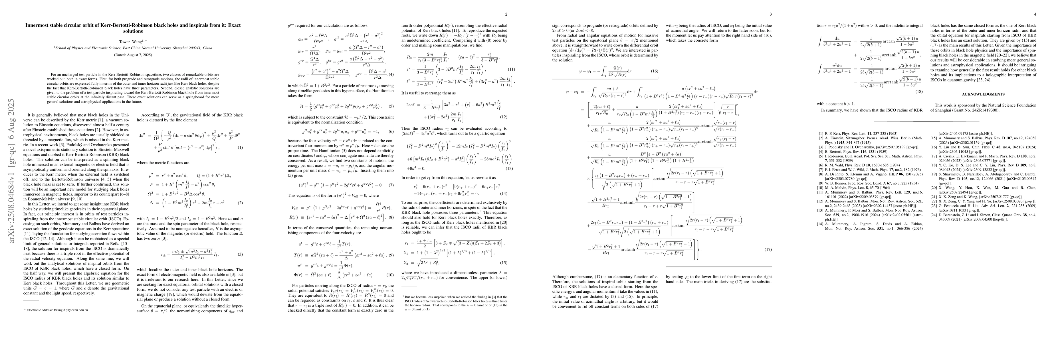 For an uncharged test particle in the Kerr-Bertotti-Robinson spacetime, two classes of remarkable orbits are worked out, both in exact forms. First, for both prograde and retrograde motions, the radii of innermost stable circular orbits are expressed fully in terms of the outer and inner horizon radii just like Kerr black holes, despite the fact that Kerr-Bertotti-Robinson black holes have three parameters. Second, closed analytic solutions are given to the problem of a test particle inspiraling toward the Kerr-Bertotti-Robinson black hole from innermost stable circular orbits at the infinitely distant past. These exact solutions can serve as a springboard for more general solutions and astrophysical applications in the future.