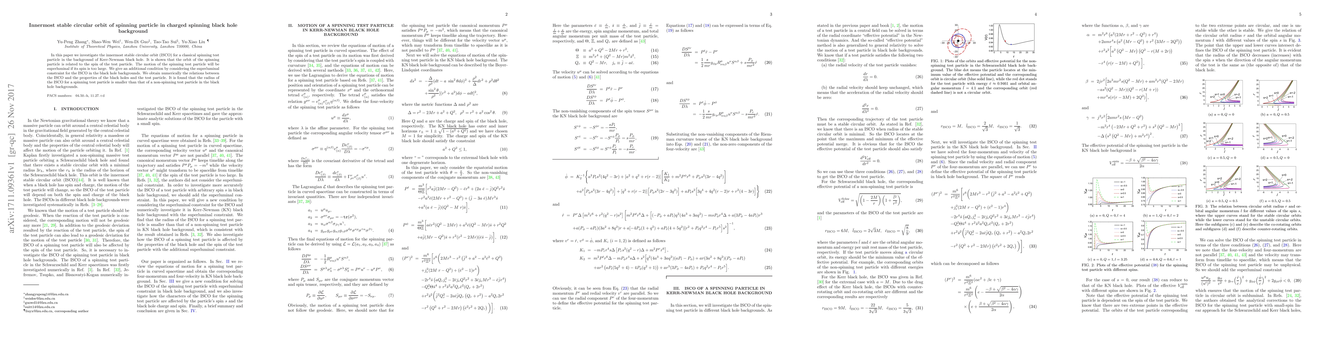 This research investigates the innermost stable circular orbit (ISCO) for a spinning test particle around a Kerr-Newman black hole, revealing that the ISCO radius is smaller for spinning particles compared to non-spinning ones. It also finds that very high spin can lead to superluminal motion for the test particle.