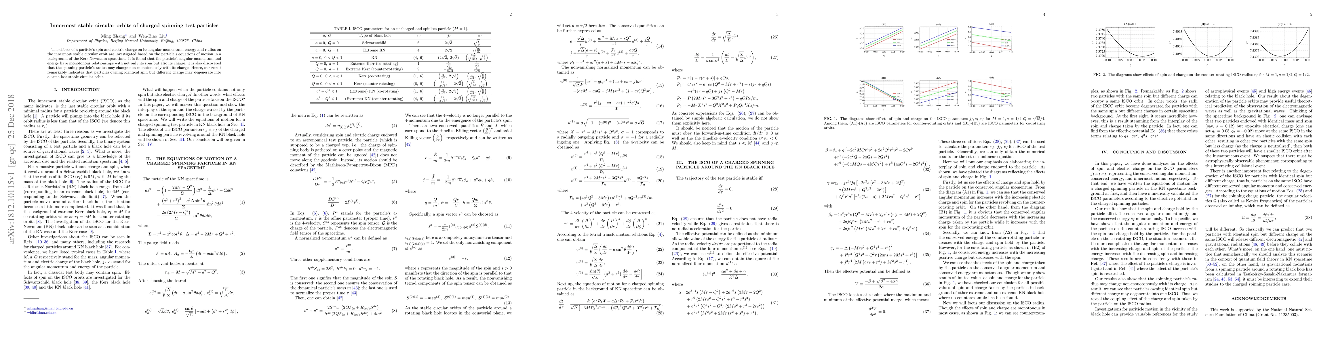 This paper investigates the innermost stable circular orbits of charged spinning test particles in Kerr-Newmann spacetime, revealing that angular momentum and energy depend on both spin and charge, while the orbit radius may vary non-monotonically with charge, indicating identical spin particles with different charges can share the same stable orbit.