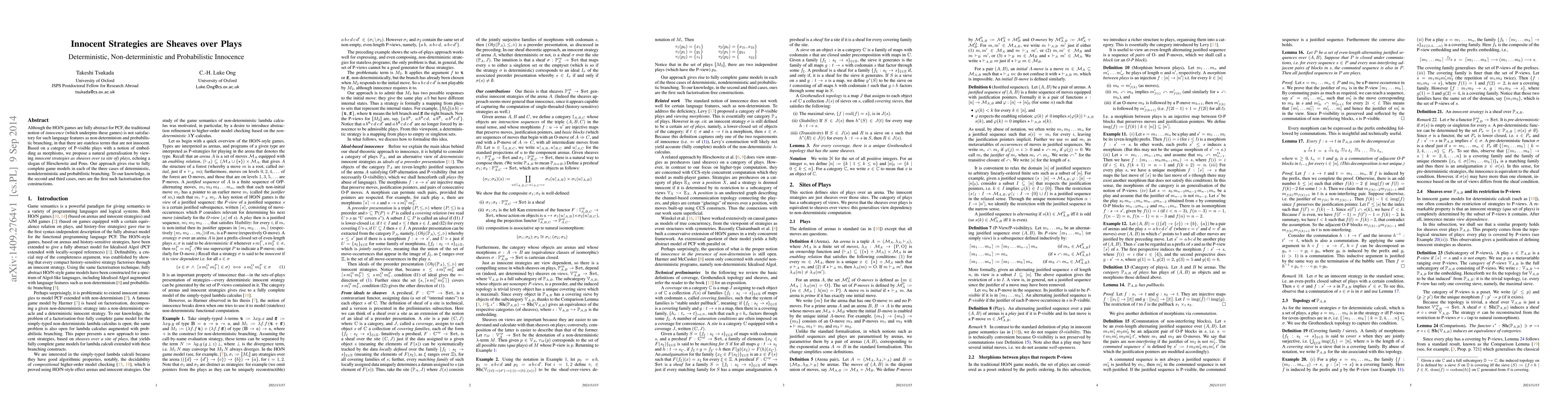 Although the HO/N games are fully abstract for PCF, the traditional notion of innocence (which underpins these games) is not satisfactory for such language features as non-determinism and probabilistic branching, in that there are stateless terms that are not innocent. Based on a category of P-visible plays with a notion of embedding as morphisms, we propose a natural generalisation by viewing innocent strategies as sheaves over (a site of) plays, echoing a slogan of Hirschowitz and Pous. Our approach gives rise to fully complete game models in each of the three cases of deterministic, nondeterministic and probabilistic branching. To our knowledge, in the second and third cases, ours are the first such factorisation-free constructions.