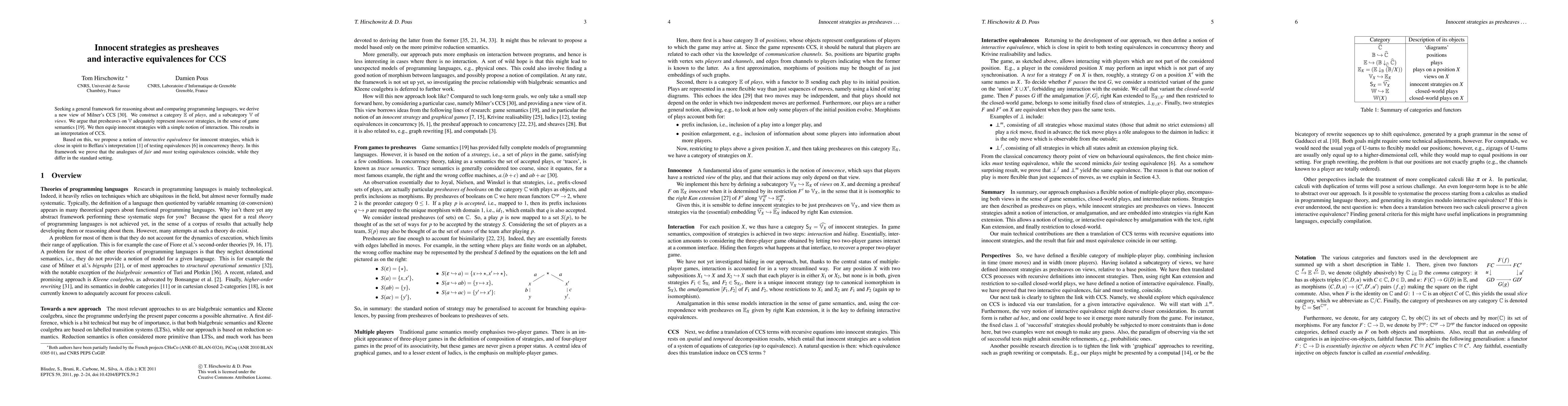 This paper introduces a novel framework for reasoning about and comparing programming languages using Milner's CCS. It constructs categories of plays and views, and uses presheaves on these to represent innocent strategies in game semantics, establishing an interpretation of CCS and proposing an interactive equivalence notion akin to Beffara's testing equivalences.