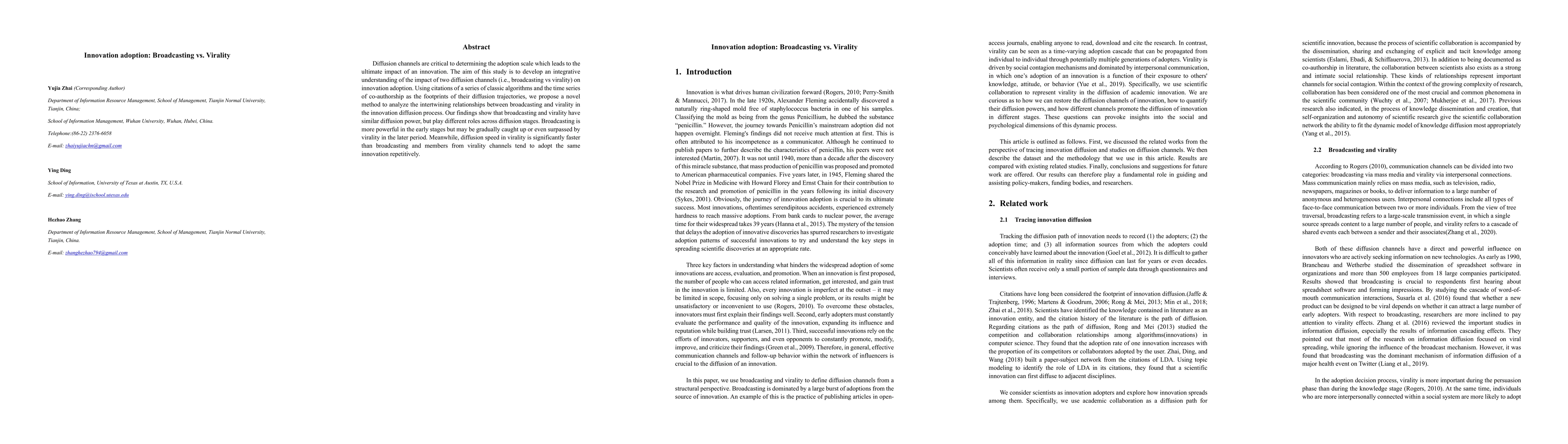 Diffusion channels are critical to determining the adoption scale which leads to the ultimate impact of an innovation. The aim of this study is to develop an integrative understanding of the impact of two diffusion channels (i.e., broadcasting vs virality) on innovation adoption. Using citations of a series of classic algorithms and the time series of co-authorship as the footprints of their diffusion trajectories, we propose a novel method to analyze the intertwining relationships between broadcasting and virality in the innovation diffusion process. Our findings show that broadcasting and virality have similar diffusion power, but play different roles across diffusion stages. Broadcasting is more powerful in the early stages but may be gradually caught up or even surpassed by virality in the later period. Meanwhile, diffusion speed in virality is significantly faster than broadcasting and members from virality channels tend to adopt the same innovation repetitively.