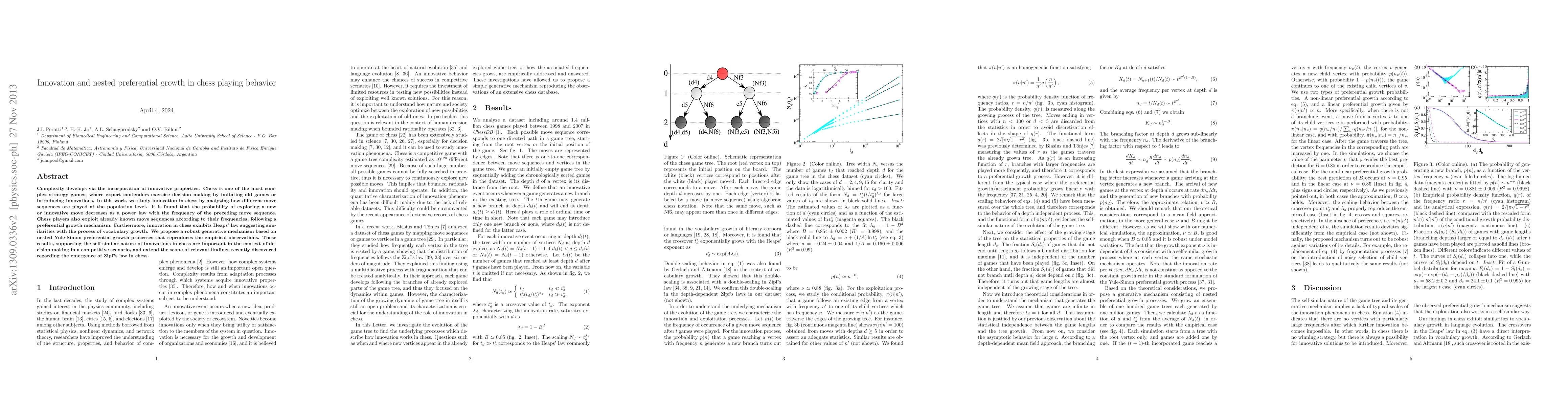 This paper investigates how chess players innovate and follow established strategies, finding that the likelihood of introducing new moves decreases with the frequency of preceding sequences, adhering to a power law. It also reveals a preferential growth mechanism and aligns with Heaps' law, proposing a generative model based on nested Yule-Simon processes to replicate these observations.