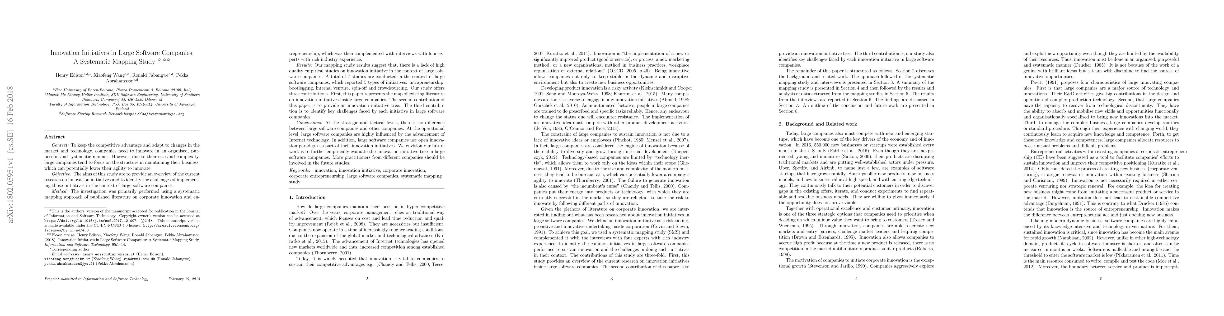 This study systematically maps existing research on innovation initiatives in large software companies, identifying five types of initiatives: intrapreneurship, bootlegging, internal venture, spin-off, and crowdsourcing. It highlights the challenges faced by these initiatives and suggests a need for more empirical studies to evaluate the effectiveness of these strategies in large software firms.