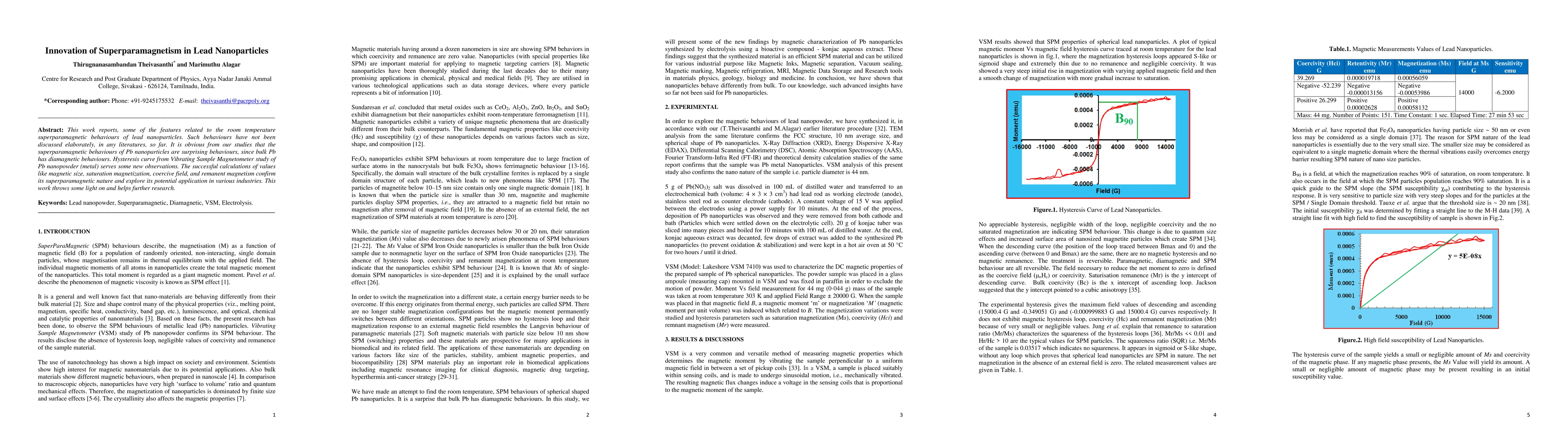 This work reports, some of the features related to the room temperature superparamagnetic behaviours of lead nanoparticles. Such behaviours have not been discussed elaborately, in any literatures, so far. It is obvious from our studies that the superparamagnetic behaviours of Pb nanoparticles are surprising behaviours, since bulk Pb has diamagnetic behaviours. Hysteresis curve from Vibrating Sample Magnetometer study of Pb nanopowder (metal) serves some new observations. The successful calculations of values like magnetic size, saturation magnetization, coercive field, and remanent magnetism confirm its superparamagnetic nature and explore its potential application in various industries. This work throws some light on and helps further research.