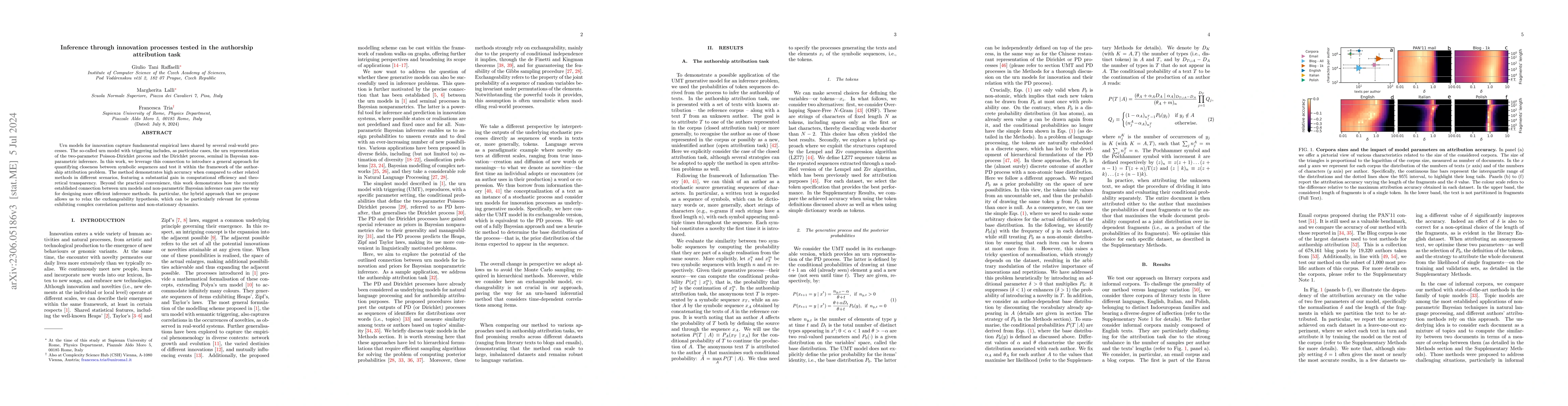 Urn models for innovation have proven to capture fundamental empirical laws shared by several real-world processes. The so-called urn model with triggering includes, as particular cases, an urn representation of the two-parameter Poisson-Dirichlet process and the Dirichlet process, seminal in Bayesian non-parametric inference. In this work, we leverage this connection to introduce a novel approach for quantifying closeness between symbolic sequences and test it within the framework of the authorship attribution problem. The method demonstrates high accuracy when compared to other state-of-the-art methods in different scenarios, featuring a substantial gain in computational efficiency and theoretical transparency. Beyond the practical convenience, this work demonstrates how the recently established connection between urn models and non-parametric Bayesian inference can pave the way for designing more efficient inference methods. In particular, the hybrid approach that we propose allows us to relax the exchangeability hypothesis, which can be particularly relevant for systems exhibiting complex correlation patterns and non-stationary dynamics.