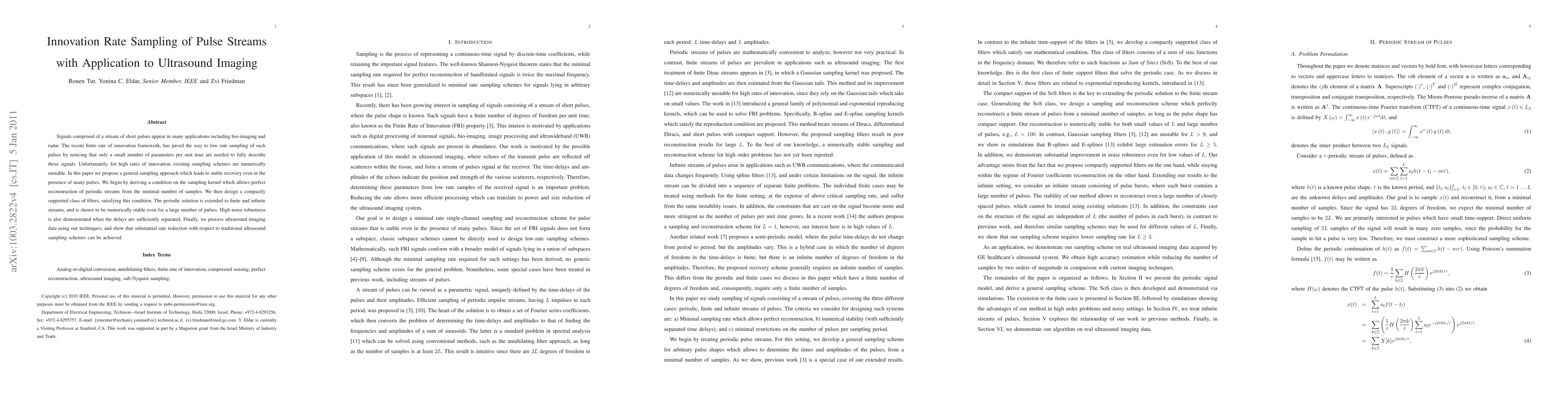 This paper proposes a stable sampling method for streams of short pulses, particularly for ultrasound imaging, leveraging the finite rate of innovation framework. The authors derive conditions for perfect reconstruction and design filters that ensure numerical stability and high noise robustness, demonstrating effective application to ultrasound imaging data.