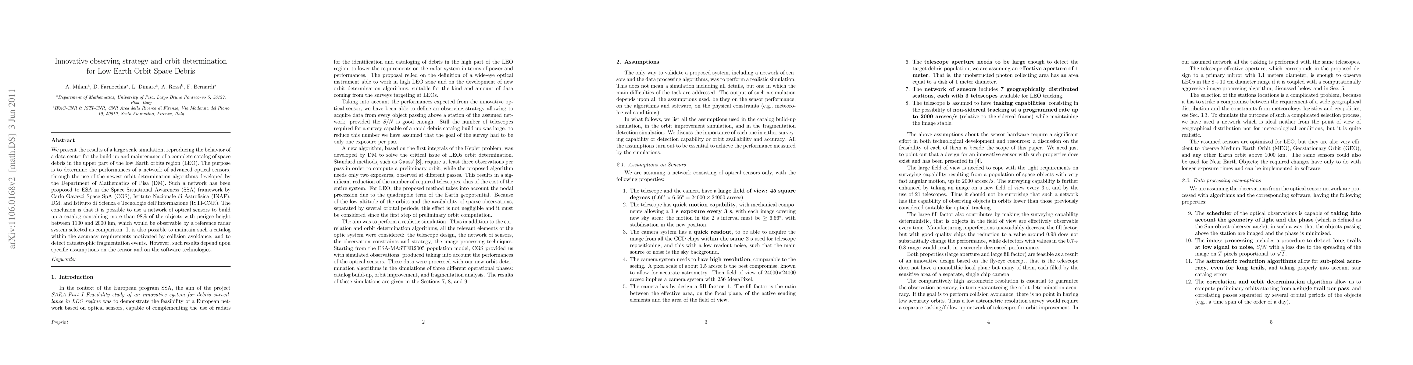 This paper presents a simulation of a data center for cataloging space debris in low Earth orbits, demonstrating the effectiveness of a network of advanced optical sensors and new orbit determination algorithms in achieving over 98% detection of objects within a specified altitude range. The results suggest the network can maintain accuracy for collision avoidance and detect fragmentation events, contingent on specific technological assumptions.