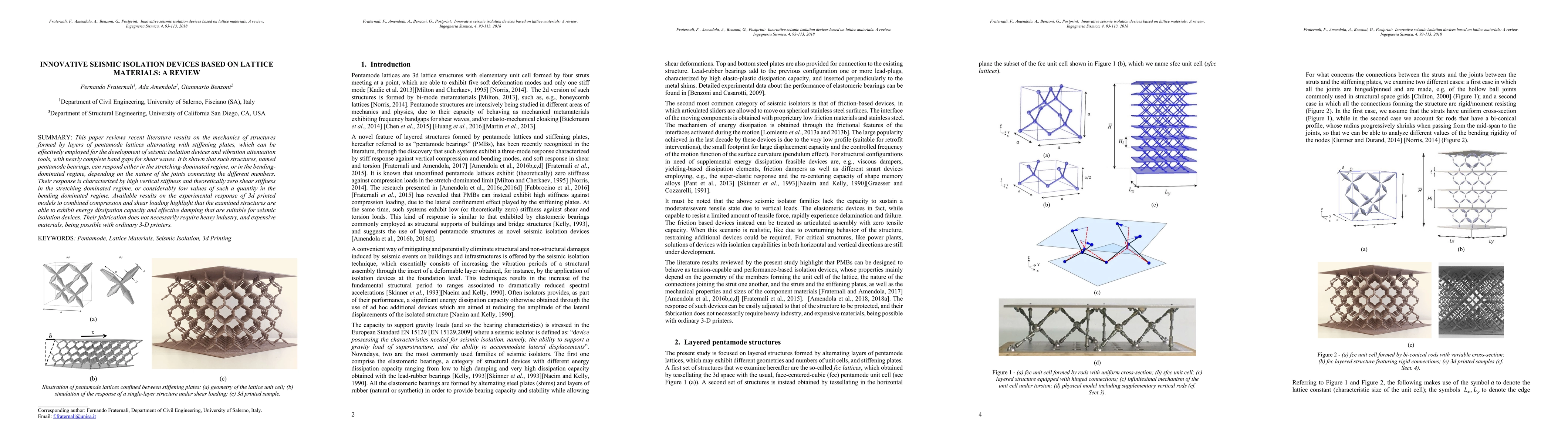 This paper reviews recent literature results on the mechanics of structures formed by layers of pentamode lattices alternating with stiffening plates, which can be effectively employed for the development of seismic isolation devices and vibration attenuation tools, with nearly complete band gaps for shear waves. It is shown that such structures, named pentamode bearings, can respond either in the stretching-dominated regime, or in the bending-dominated regime, depending on the nature of the joints connecting the different members. Their response is characterized by high vertical stiffness and theoretically zero shear stiffness in the stretching dominated regime, or considerably low values of such a quantity in the bending dominated regime. Available results on the experimental response of 3d printed models to combined compression and shear loading highlight that the examined structures are able to exhibit energy dissipation capacity and effective damping that are suitable for seismic isolation devices. Their fabrication does not necessarily require heavy industry, and expensive materials, being possible with ordinary 3-D printers.