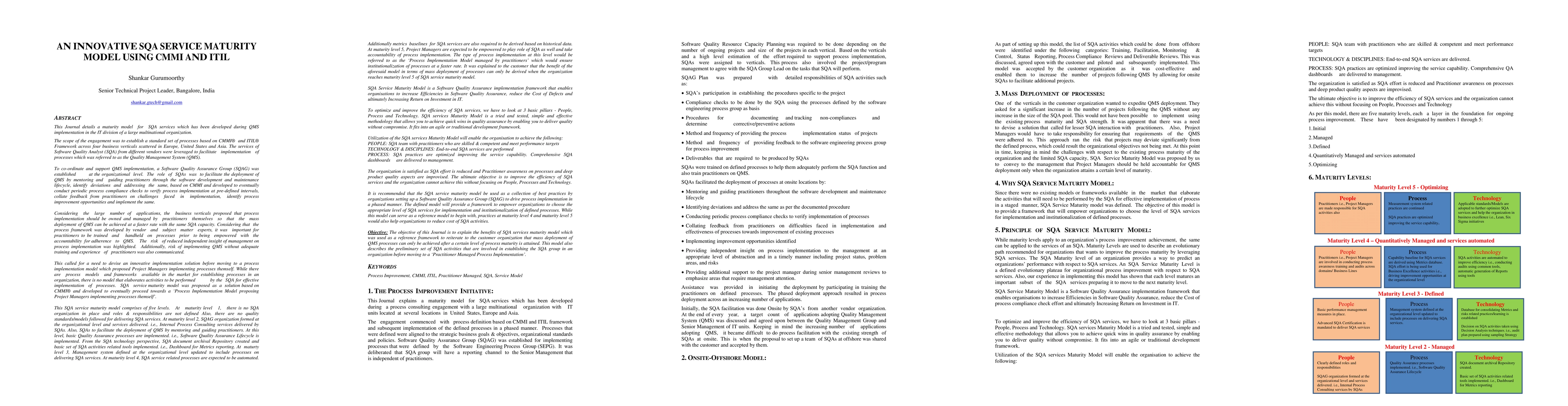 This paper presents an innovative SQA Service Maturity Model developed using CMMI and ITIL frameworks to standardize processes across multiple business verticals. The model aims to enhance efficiency, reduce defect costs, and improve ROI in IT by enabling practitioners to manage their own process implementation.