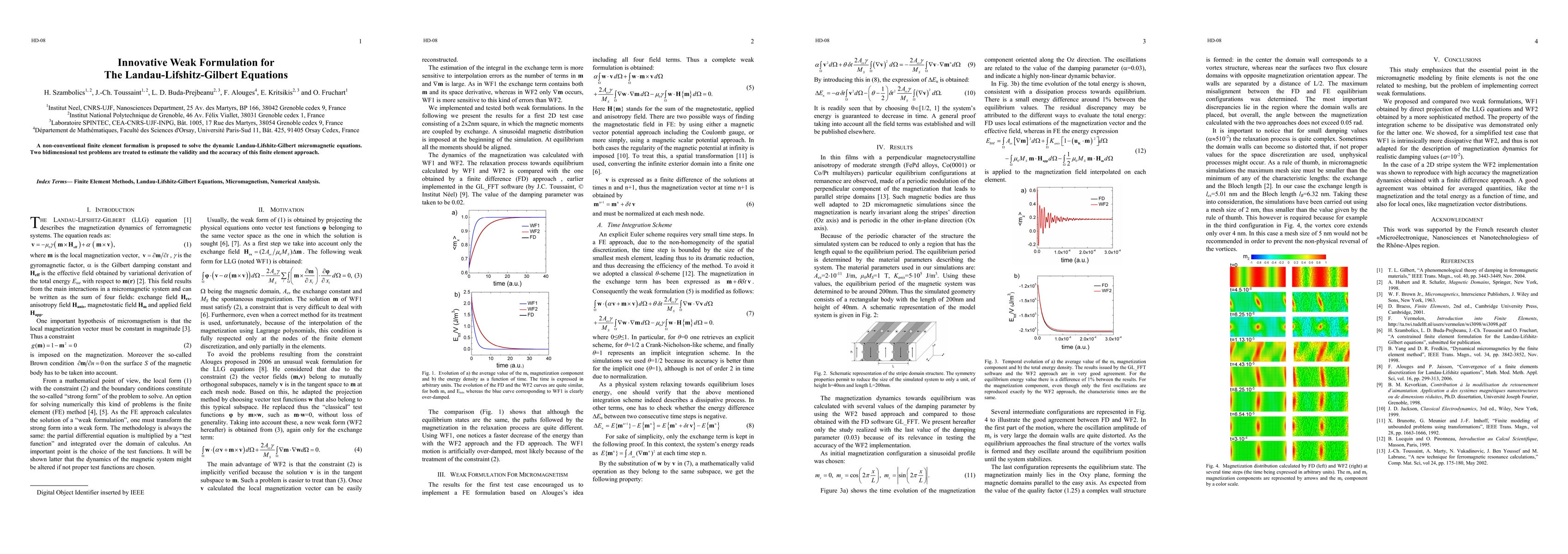 Summary: This paper introduces a novel finite element method to address the Landau-Lifshitz-Gilbert micromagnetic equations, demonstrating its effectiveness and accuracy through two bidimensional test problems.