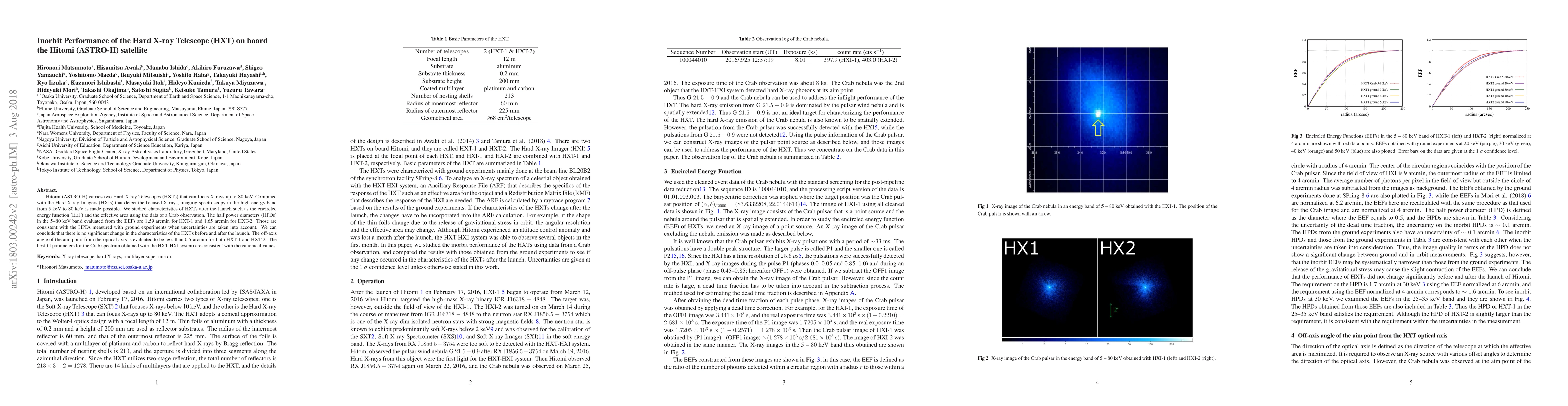 The Hitomi (ASTRO-H) satellite's Hard X-ray Telescopes (HXTs) maintained their pre-launch characteristics post-launch, with half power diameters of 1.59 arcmin for HXT-1 and 1.65 arcmin for HXT-2, and an off-axis angle of less than 0.5 arcmin, confirming consistent performance. The HXT-HXI system's best-fit Crab spectrum parameters align with canonical values.