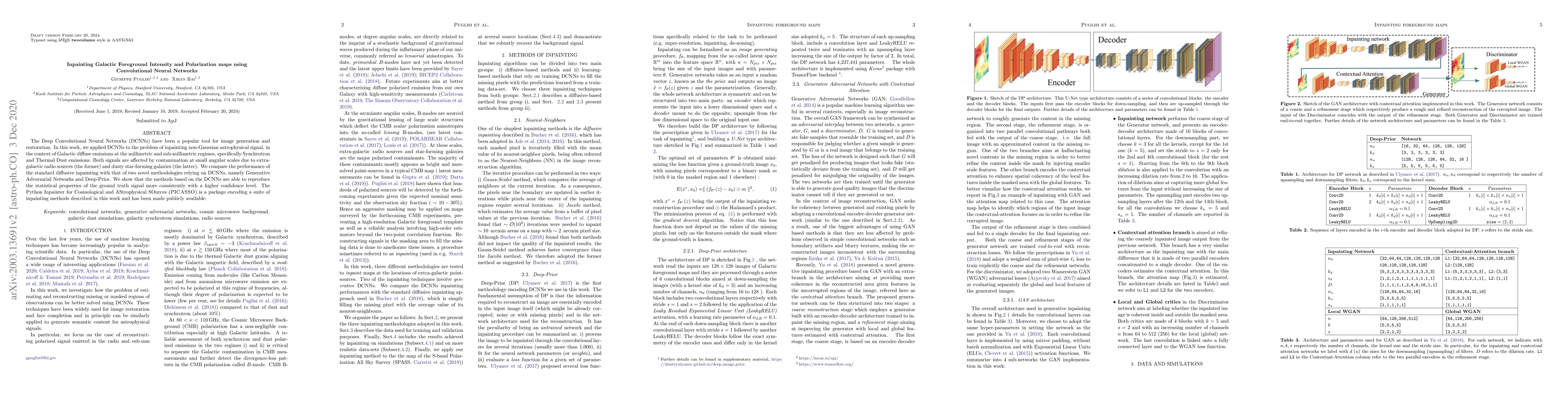 Deep convolutional neural networks have been a popular tool for image generation and restoration. The performance of these networks is related to the capability of learning realistic features from a large dataset. In this work, we applied the problem of inpainting non-Gaussian signal, in the context of Galactic diffuse emissions at the millimetric and sub-millimetric regimes, specifically Synchrotron and Thermal Dust emission. Both of them are affected by contamination at small angular scales due to extra-galactic radio sources (the former) and to dusty star-forming galaxies (the latter). We consider the performances of a nearest-neighbors inpainting technique and compare it with two novels methodologies relying on generative Neural Networks. We show that the generative network is able to reproduce the statistical properties of the ground truth signal more consistently with high confidence level. The Python Inpainter for Cosmological and AStrophysical SOurces (PICASSO) is a package encoding a suite of inpainting methods described in this work and has been made publicly available.