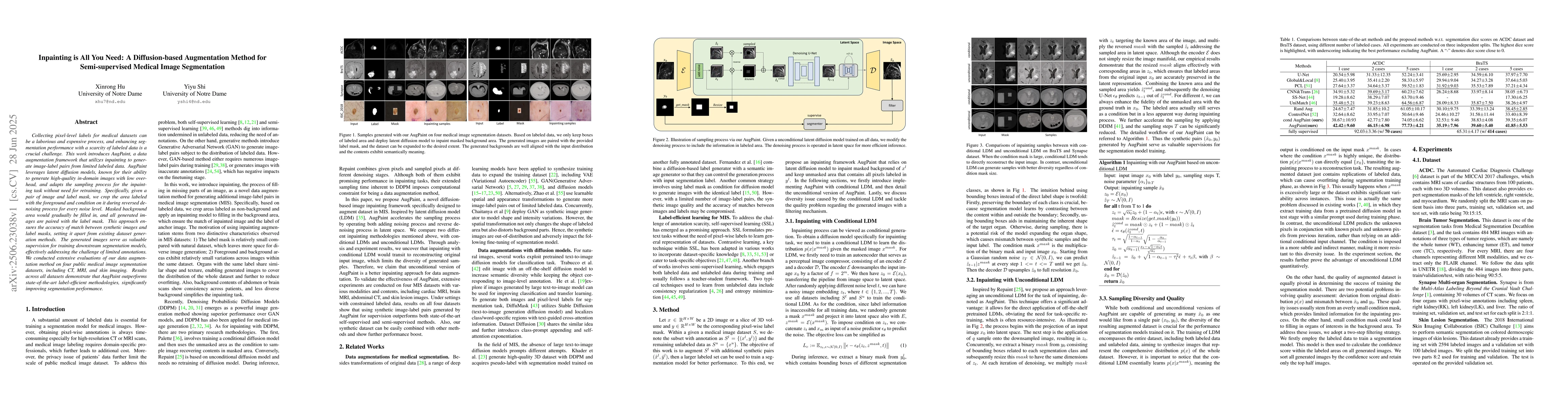 Collecting pixel-level labels for medical datasets can be a laborious and expensive process, and enhancing segmentation performance with a scarcity of labeled data is a crucial challenge. This work introduces AugPaint, a data augmentation framework that utilizes inpainting to generate image-label pairs from limited labeled data. AugPaint leverages latent diffusion models, known for their ability to generate high-quality in-domain images with low overhead, and adapts the sampling process for the inpainting task without need for retraining. Specifically, given a pair of image and label mask, we crop the area labeled with the foreground and condition on it during reversed denoising process for every noise level. Masked background area would gradually be filled in, and all generated images are paired with the label mask. This approach ensures the accuracy of match between synthetic images and label masks, setting it apart from existing dataset generation methods. The generated images serve as valuable supervision for training downstream segmentation models, effectively addressing the challenge of limited annotations. We conducted extensive evaluations of our data augmentation method on four public medical image segmentation datasets, including CT, MRI, and skin imaging. Results across all datasets demonstrate that AugPaint outperforms state-of-the-art label-efficient methodologies, significantly improving segmentation performance.
