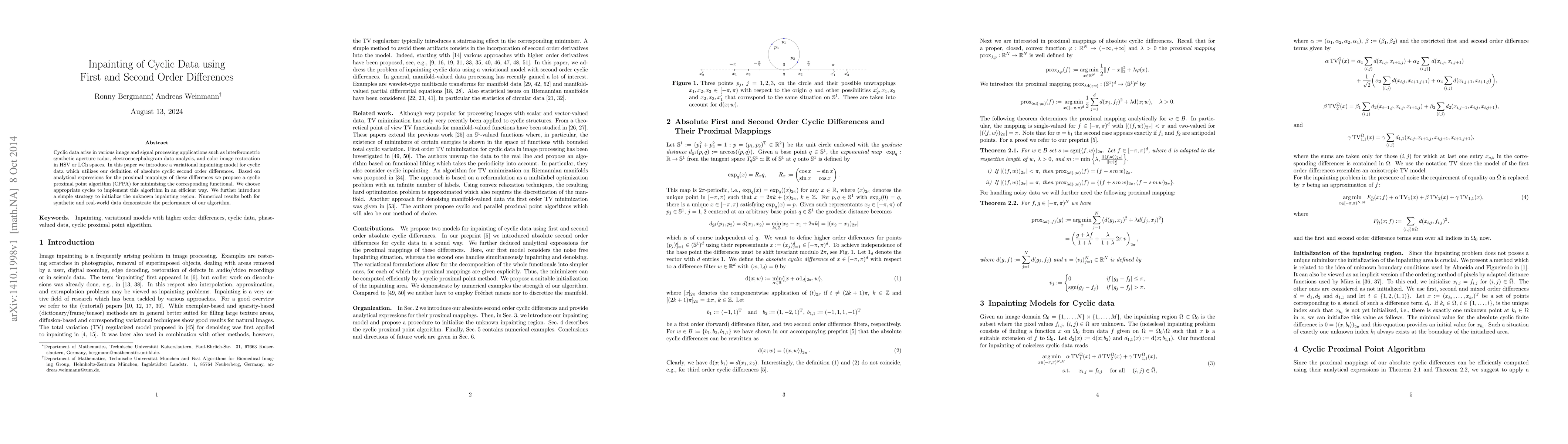 Cyclic data arise in various image and signal processing applications such as interferometric synthetic aperture radar, electroencephalogram data analysis, and color image restoration in HSV or LCh spaces. In this paper we introduce a variational inpainting model for cyclic data which utilizes our definition of absolute cyclic second order differences. Based on analytical expressions for the proximal mappings of these differences we propose a cyclic proximal point algorithm (CPPA) for minimizing the corresponding functional. We choose appropriate cycles to implement this algorithm in an efficient way. We further introduce a simple strategy to initialize the unknown inpainting region. Numerical results both for synthetic and real-world data demonstrate the performance of our algorithm.