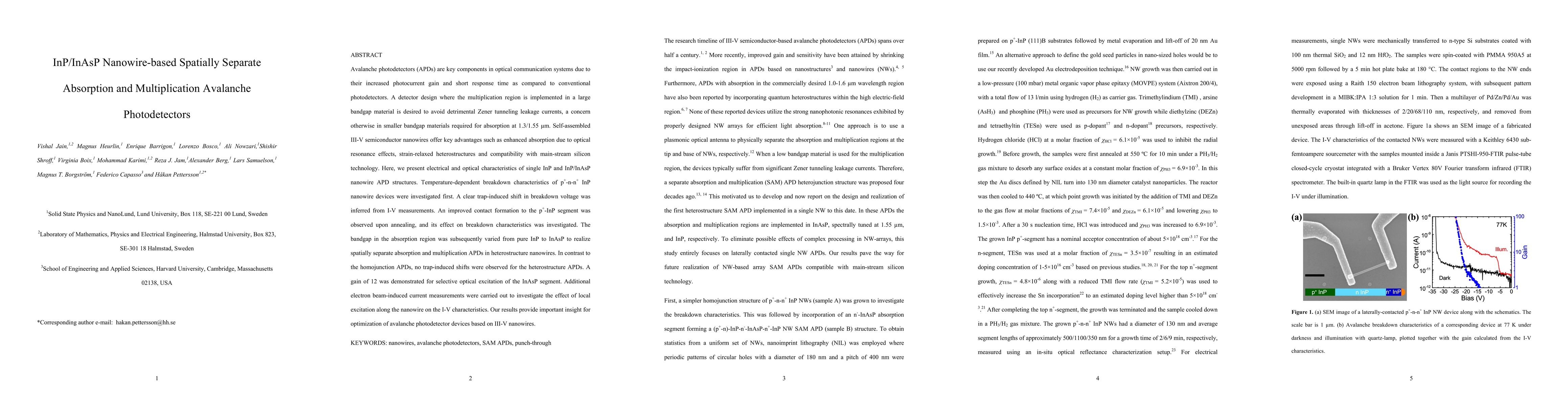 This paper investigates the electrical and optical characteristics of InP/InAsP nanowire-based avalanche photodetectors (APDs) with spatially separated absorption and multiplication regions to mitigate Zener tunneling leakage currents. The study reveals improved breakdown characteristics and a gain of 12 upon selective optical excitation of the InAsP segment, providing insights for optimizing APDs using III-V nanowires.
