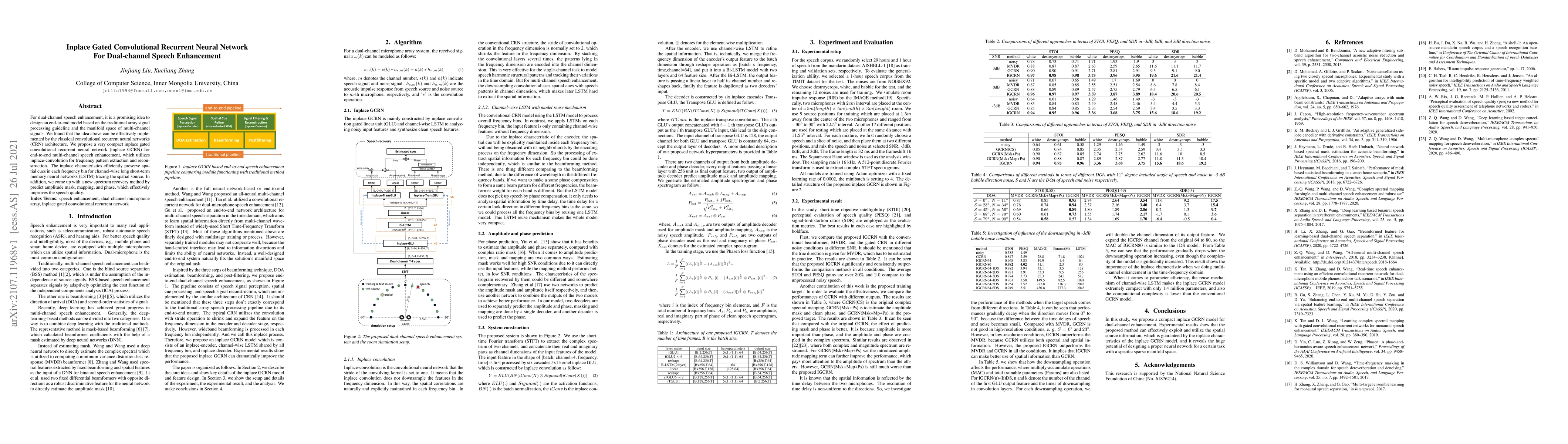 This paper proposes an inplace gated convolutional recurrent neural network (inplace GCRN) for dual-channel speech enhancement, utilizing inplace-convolution for efficient frequency pattern extraction and LSTM for spatial source tracing. The method also introduces a spectrum recovery technique via amplitude mask, mapping, and phase prediction to improve speech quality.