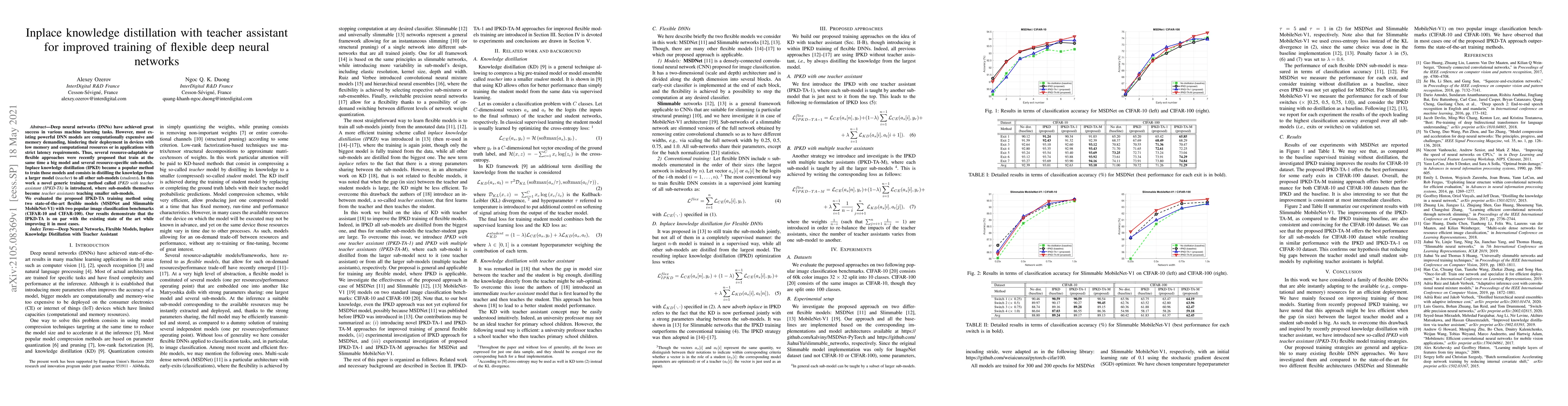 This paper introduces IPKD with teacher assistant (IPKD-TA), a novel training method for flexible deep neural networks that enhances inplace knowledge distillation by having sub-models act as teacher assistants. The proposed method was evaluated on MSDNet and Slimmable MobileNet-V1, showing improved performance compared to existing methods on CIFAR-10 and CIFAR-100 benchmarks.